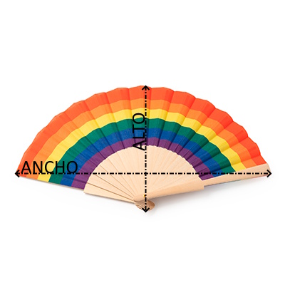 Abanico con varillas de madera y tela con estampado multicolor.