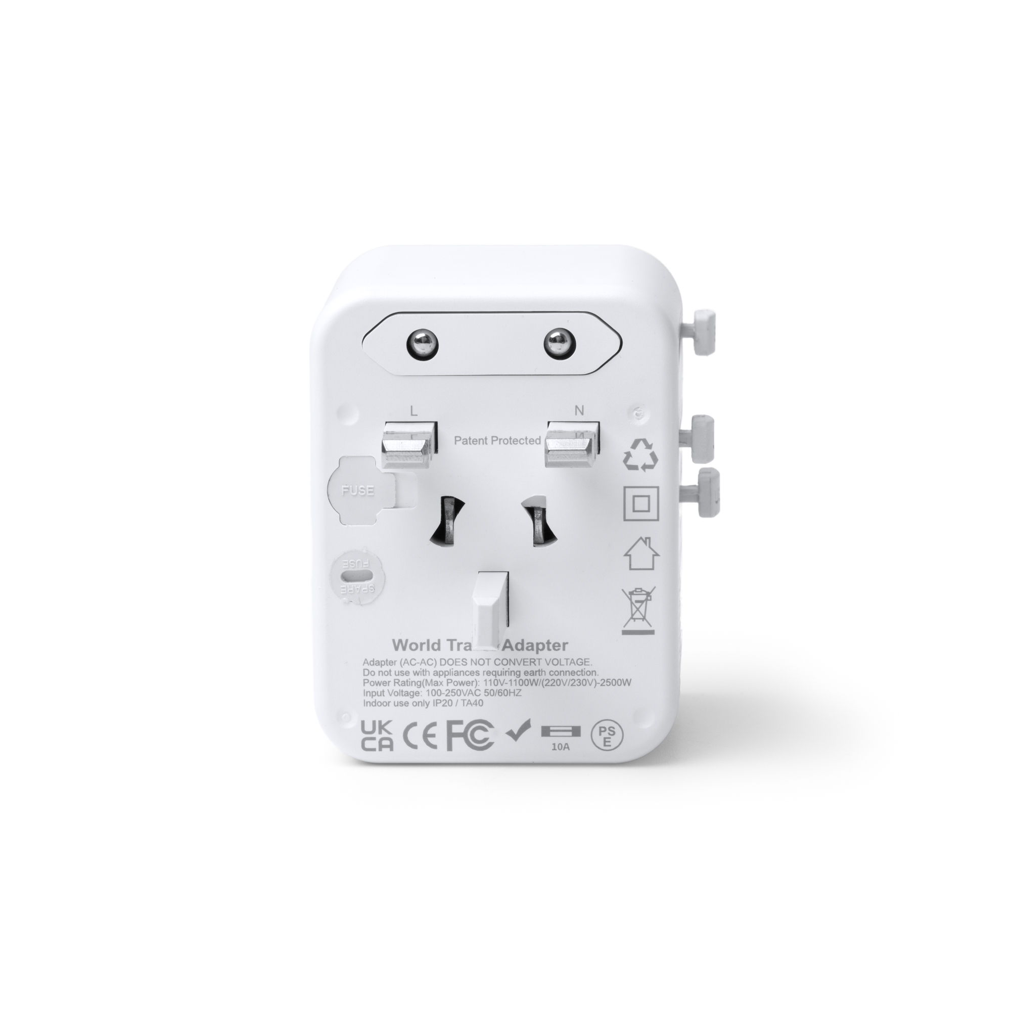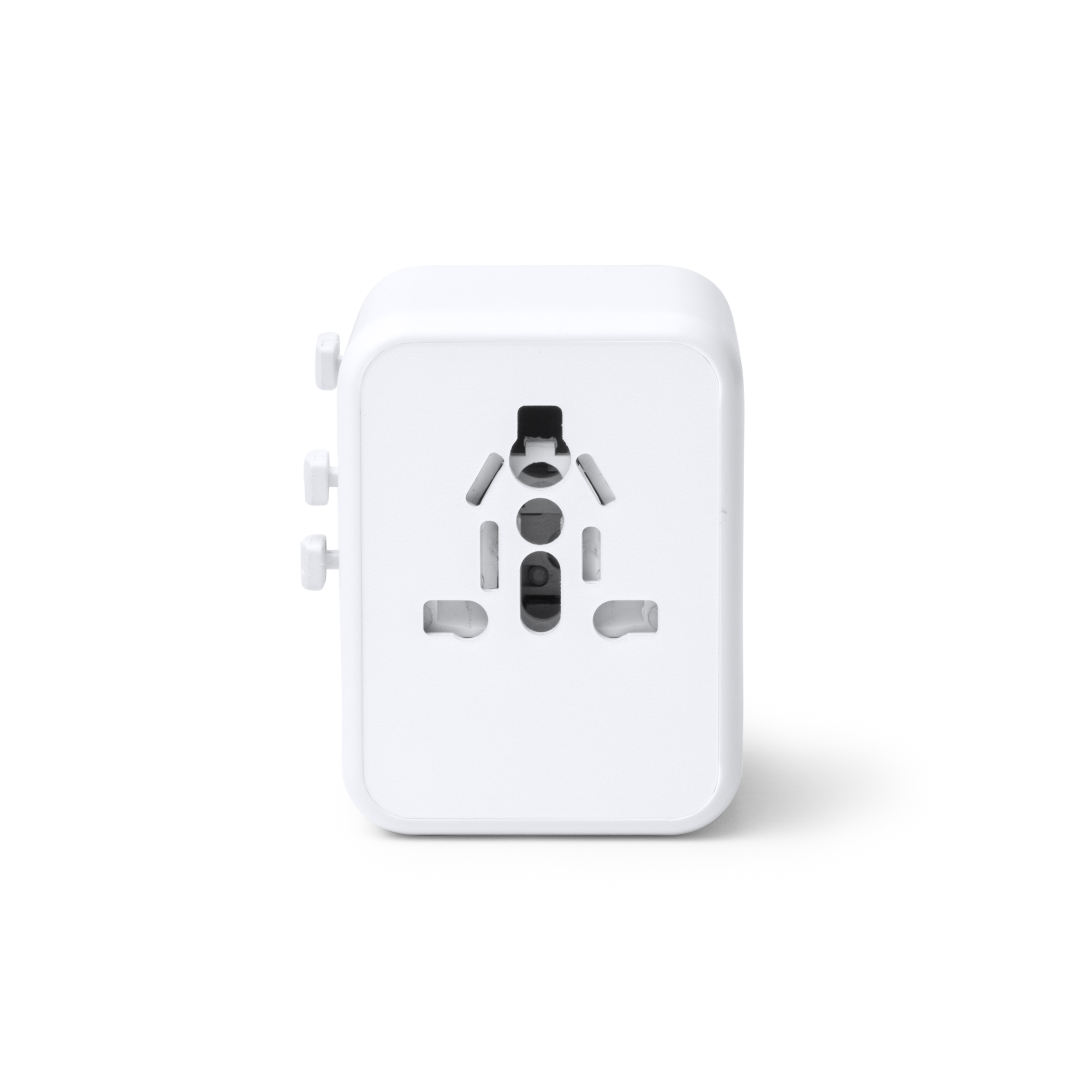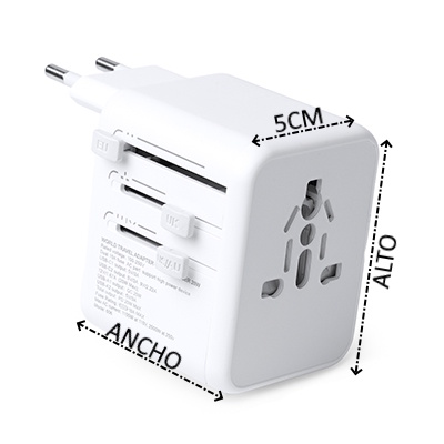 Adaptador de enchufes para viajes. Elaborado en policarbonato de alta calidad con una potencia de 20W y carga rápida. Cuenta con dos salidas USB y dos Tipo C. Es válido para usarse en Europa, Reino Unido, Estados Unidos, Asia y Australia.