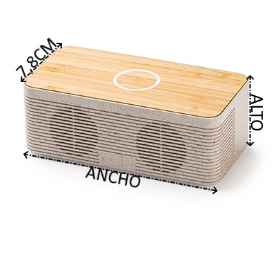 Altavoz inalámbrico con cuerpo elaborado en fibra de trigo y superficie en bambú. Con 5W de potencia y conexión Bluetooth. Distancia máxima de funcionamiento del altavoz de hasta 5 horas. Cuenta con función de carga inalámbrica en la superficie con 10W para recarga de dispositivos provistos de esta tecnología. Con indicador luminoso, puerto de entrada Mini Jack para salida de audio en modo auxiliar y botón encendido/apagado multifunción.