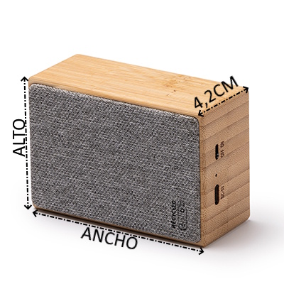 Altavoz inalámbrico con cuerpo elaborado en bambú y superficie en poliéster reciclado RPET, con 3W de potencia con batería recargable. Salida de audio mediante conexión Bluetooth. Cuenta con indicador luminoso de conexión, control de encendido/apagado y puerto de carga. Distancia de funcionamiento de hasta 10 metros.