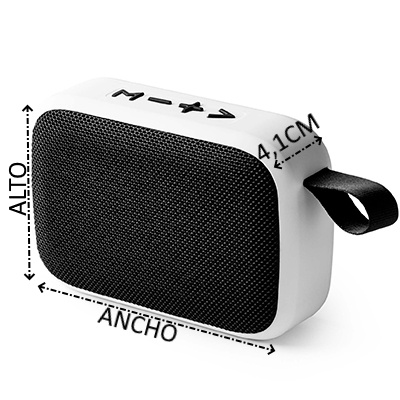 Altavoz inalámbrico Bluetooth bicolor. Cuerpo en acabado mate de tacto goma. Asa de transporte, botones y tela a juego. Potencia 3W. Batería recargable. Cable incluido. Presentación en caja diseño.