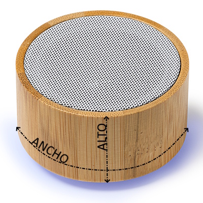 Altavoz inalámbrico redondo con cuerpo elaborado en ABS y bambú. Con base antideslizante y rejilla en color blanco. Con batería recargable y potencia de 3W. Tiempo máximo de reproducción de hasta 4 horas. Con función manos libres y micrófono para realizar llamadas. Reproducción de audio Bluetooth, Radio FM y mediante tarjeta MicroSD. Incluye botones en la parte trasera para control de reproducción de audio y llamadas.