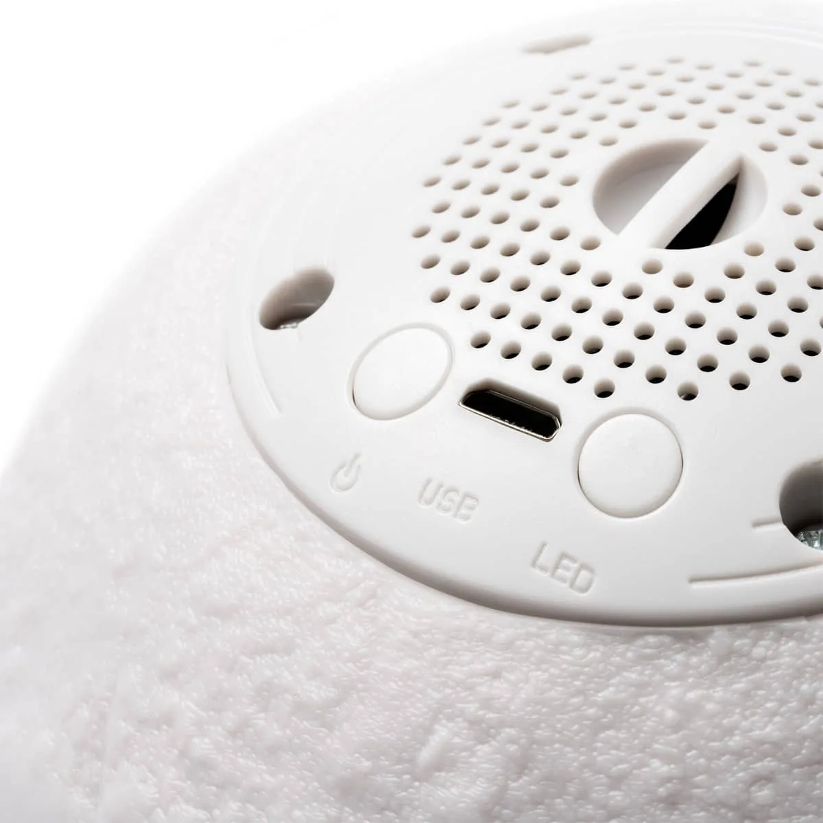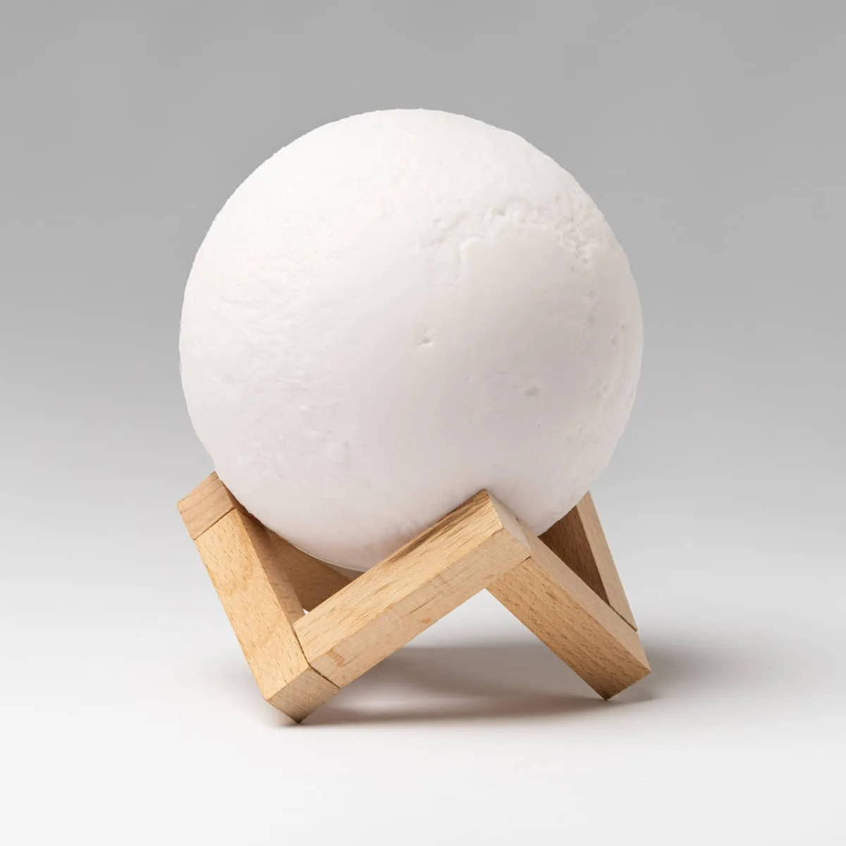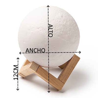 Altavoz inalámbrico recargable de 3W con diseño lunar. Soporte realizado en madera. Función lámpara con diferentes modos de iluminación: luz cálida y luz fría. Reproducción mediante conexión Bluetooth. Incluye botones de control de iluminación y de encendido/apagado en la base.