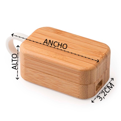 Auriculares inalámbricos con estuche elaborado en bambú. Con conexión Bluetooth y función de manos libres. El control de manos libres se puede realizar mediante botón táctil integrado en cada auricular. Cuenta con función de reproducción de audio con control de pistas y volumen.