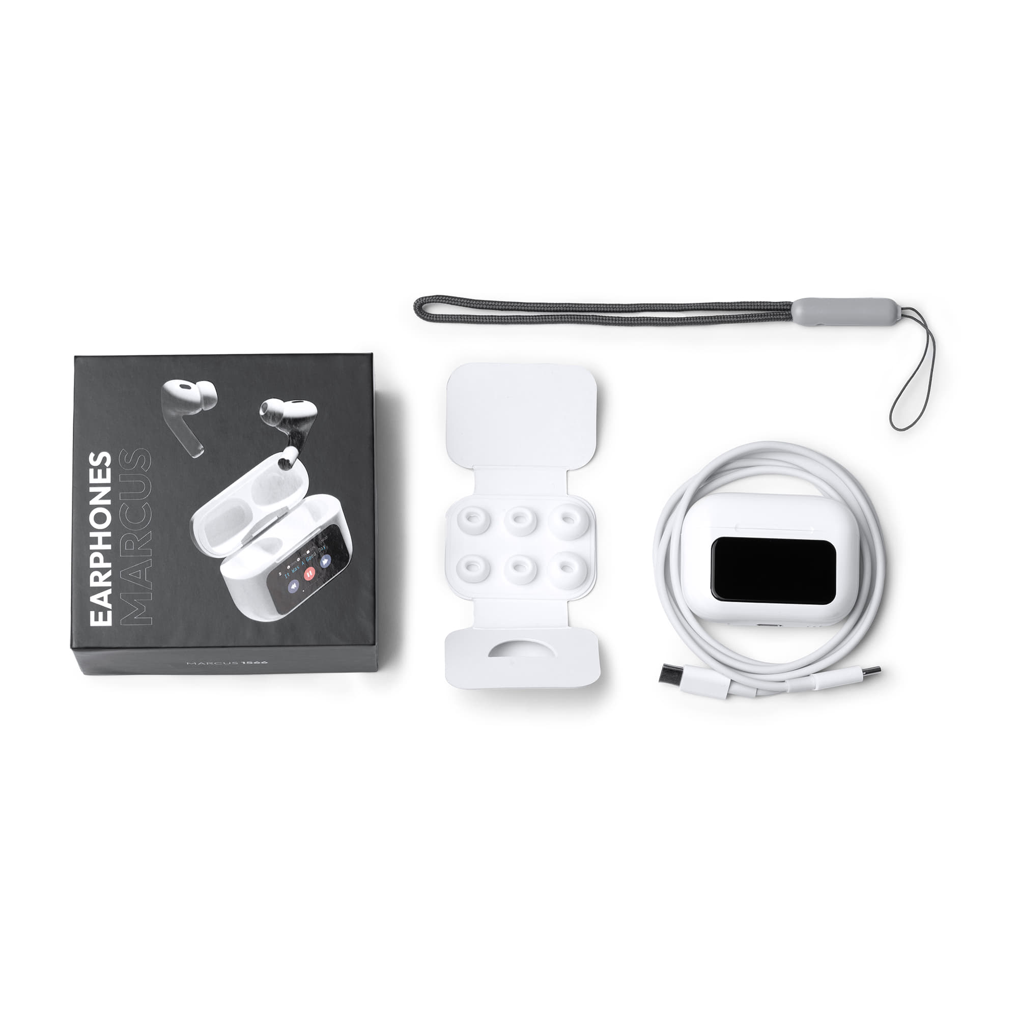 Auriculares inalámbricos con estuche equipado con pantalla táctil. Cuenta con función cancelación de ruido y selección de modos de ecualizador. También cuenta con función asistente de voz mediante botón lateral del auricular y función de búsqueda del auricular, hacer foto y linterna. Con opción de vinculación con redes sociales con contenido audiovisual y función de “Me gusta” mediante la pantalla táctil. Pantalla en 16 idiomas disponibles.