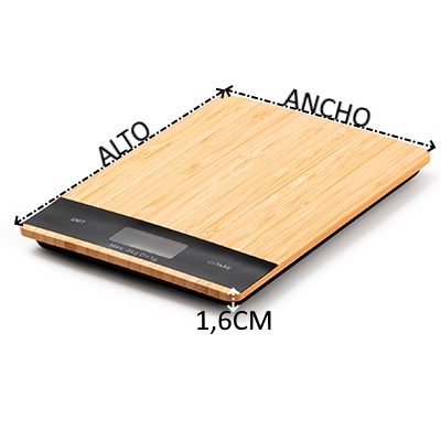 Báscula de cocina digital con carcasa frontal de bambú. Ideal para pesar los ingredientes y los alimentos cuando cocines tus mejores recetas. Con una capacidad máxima de 5 kg. Funciona con una pila incluida.