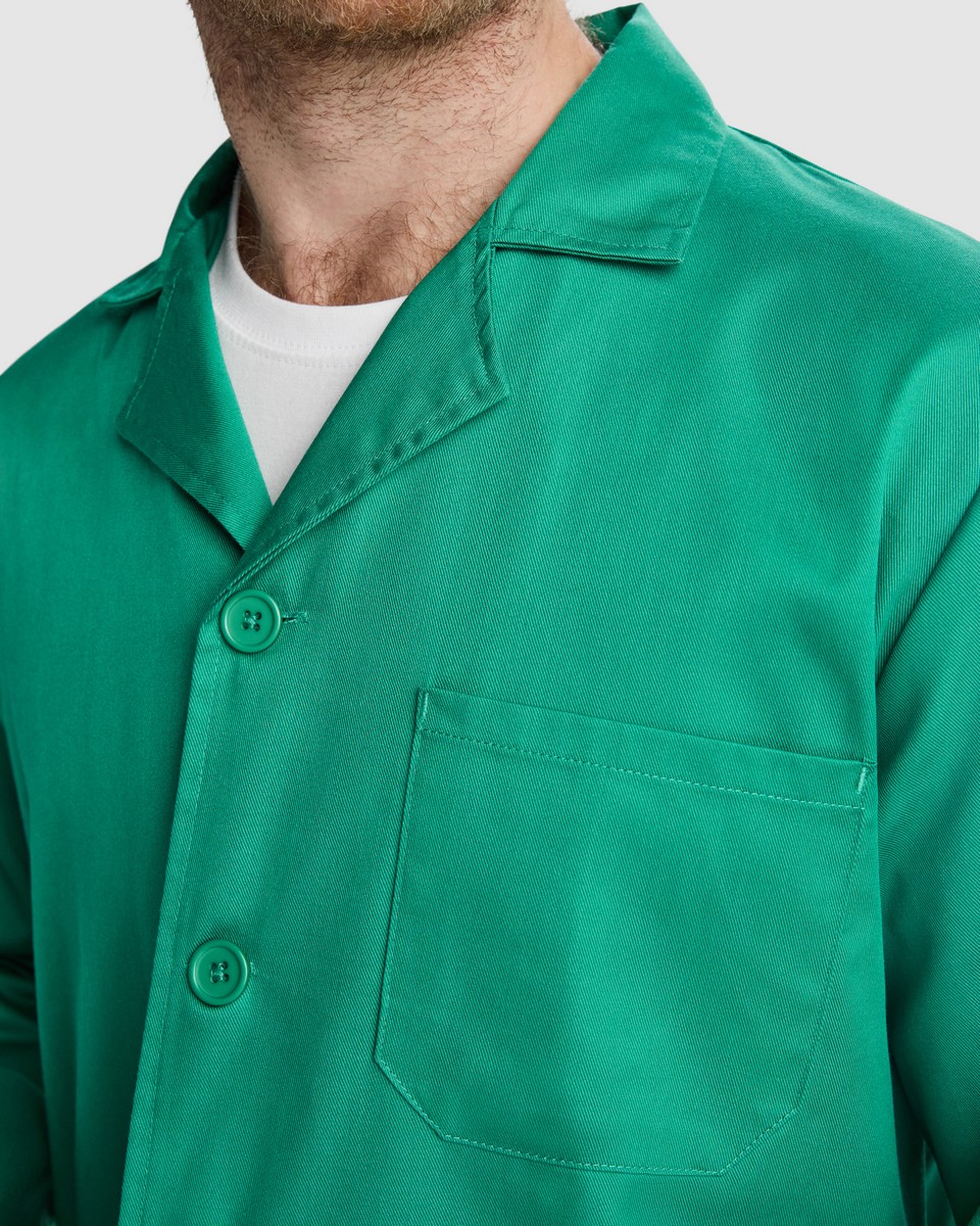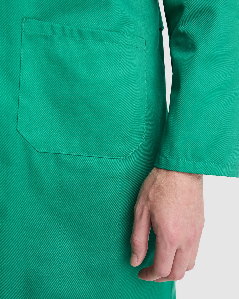 Nuestra bata de servicios “Vaccine” es una bata Unisex de manga larga con cuello con solapa, apertura central con 5 botones a tono, un bolsillo en el pecho y dos laterales, y cinturilla trasera.