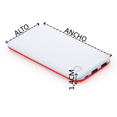 Batería externa elaborada en ABS bicolor con capacidad de 10000 mAh. Indicador luminoso de porcentaje de carga. Con puerto de entrada Tipo C y puerto USB de salida. Compatible con Smartphone, cámaras digitales y consolas. Cable Tipo C incluido.