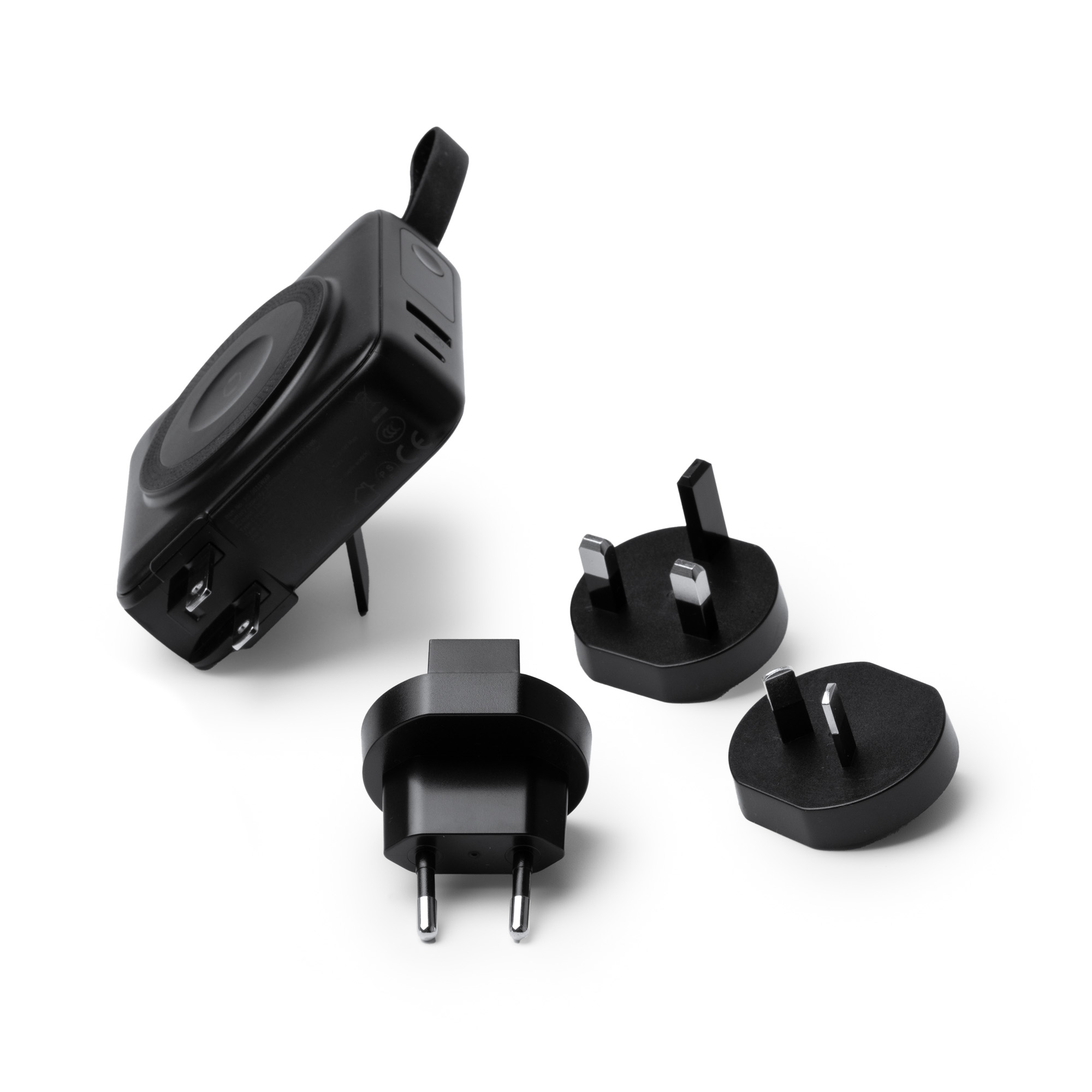 Batería externa 3 en 1 de 10.000 mAh con carga rápida, con potencia de 15W para carga inalámbrica y 20W para carga mediante cable. Elaborada en ABS, con base para carga inalámbrica para dispositivos que estén provistos de esta tecnología. Incorpora un cable de conexión tipo C y otro tipo Lightning ensamblados en el cuerpo, además de una pantalla con indicador de porcentaje de carga. Incluye puertos de entrada y salida Tipo C y USB, adaptadores para corriente de diferentes países para su uso a través de la corriente eléctrica, lo que permite utilizarlo como cabezal de carga, además de poder usarse de forma inalámbrica como powerbank. Incluye un anillo magnético, una correa de silicona para hacer más cómodo su transporte y uso, además de una base de sujeción integrada en su parte trasera que funciona a modo de soporte para el móvil. Su diseño y estructura permite poder cargar varios dispositivos a la vez.