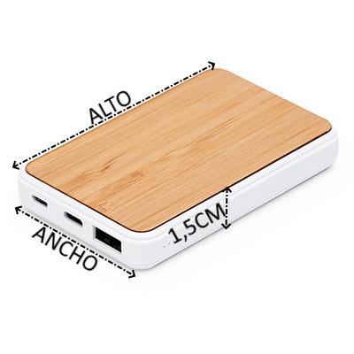 Batería externa de 5000 mAh, con cuerpo rectangular de ABS blanco y superficie de bambú. Cuenta con dos puertos tipo C y puerto USB. Indicador luminoso de carga. Salida corriente tipo C.