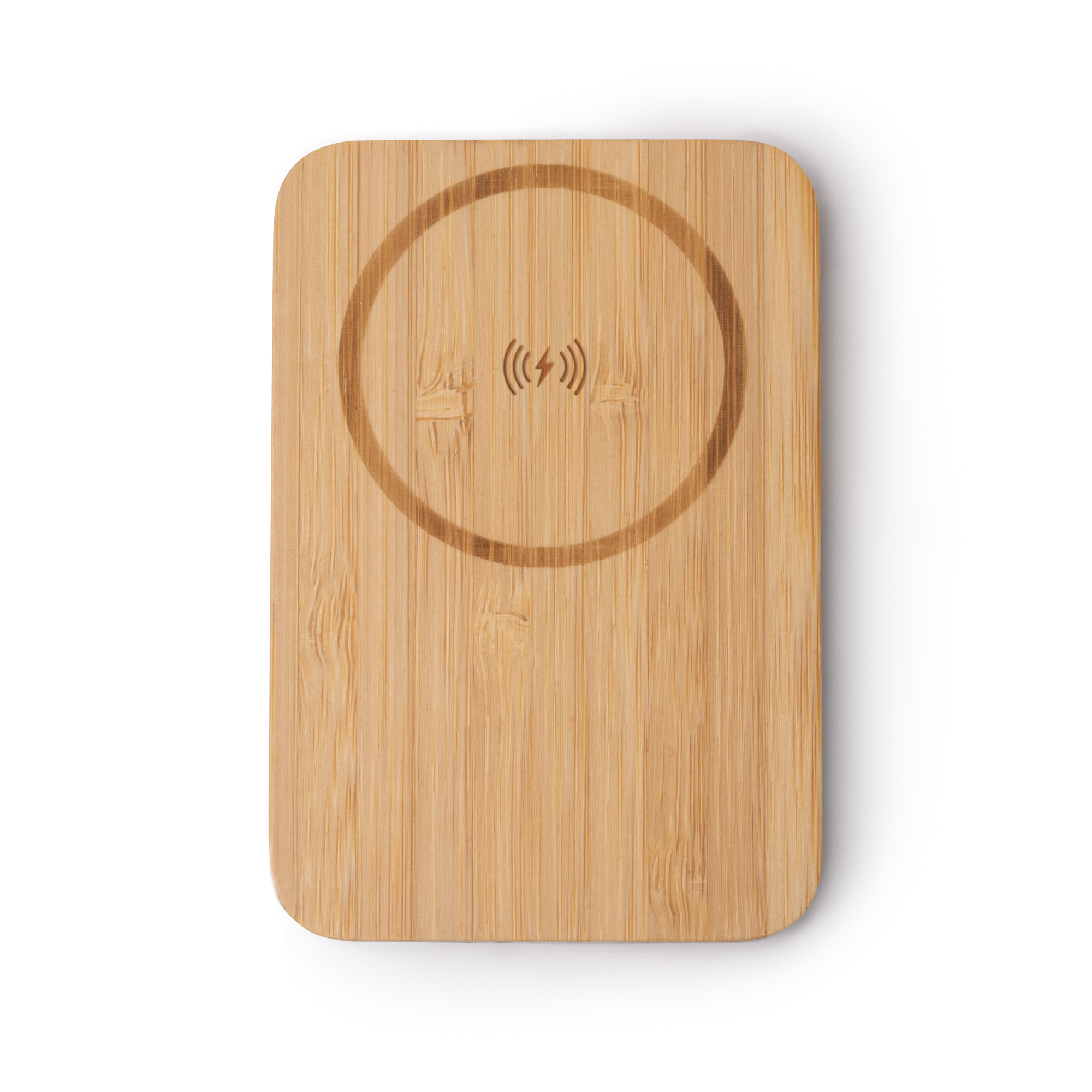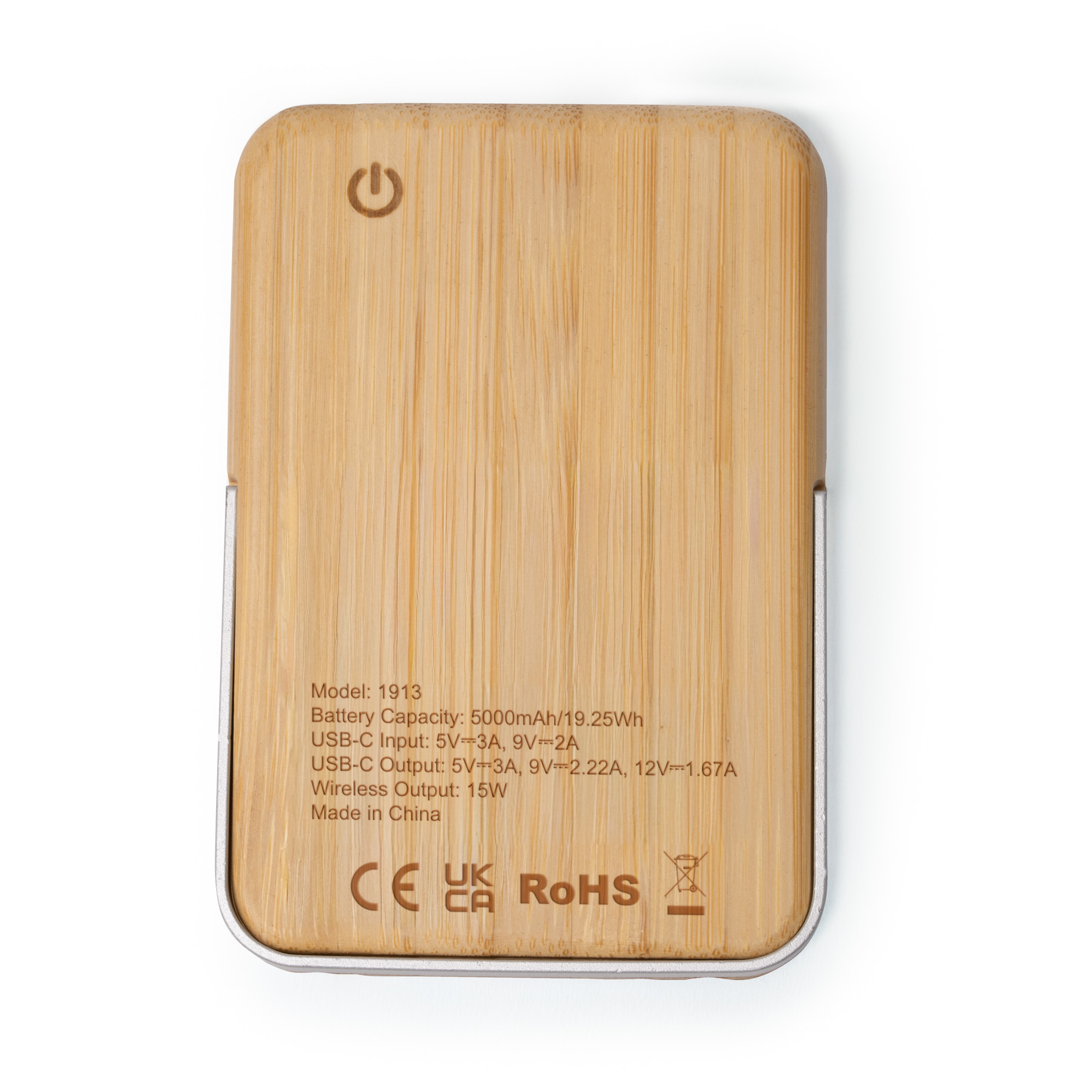 Batería externa de 5000 mAh con cuerpo elaborado en bambú y soporte vertical abatible en aluminio reciclado. Cuenta con cargador magnético inalámbrico para dispositivos provistos de esta tecnología y una potencia de 15W. Incluye indicador luminoso de carga. Cable de conexión tipo C inlcuido.