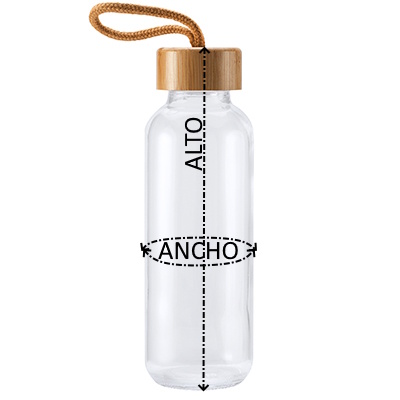 Bidón de cristal de 450ml con tapón de bambú y cintra transporte de acabado natural.