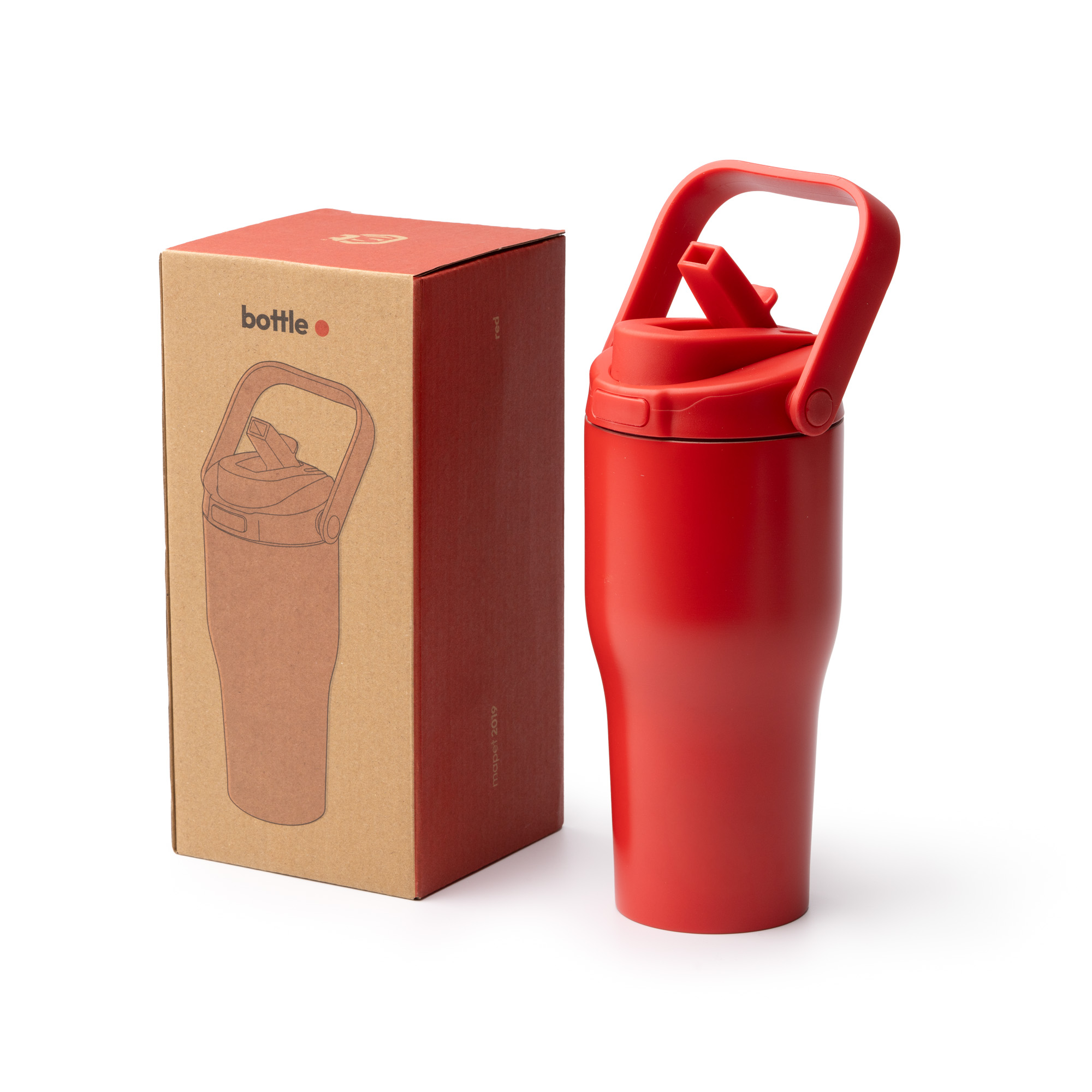 Bidón térmico elaborado en acero inoxidable 304 reciclado de doble pared con capacidad para 550ml. Cuenta con tapa a rosca con dosificador automático de doble apertura mediante botón a presión, incorporando pajita abatible en él. Incluye refuerzos de silicona que conforman un sistema antigoteo, que evita fugas de líquidos. Incorpora asa completa de transpoorte.