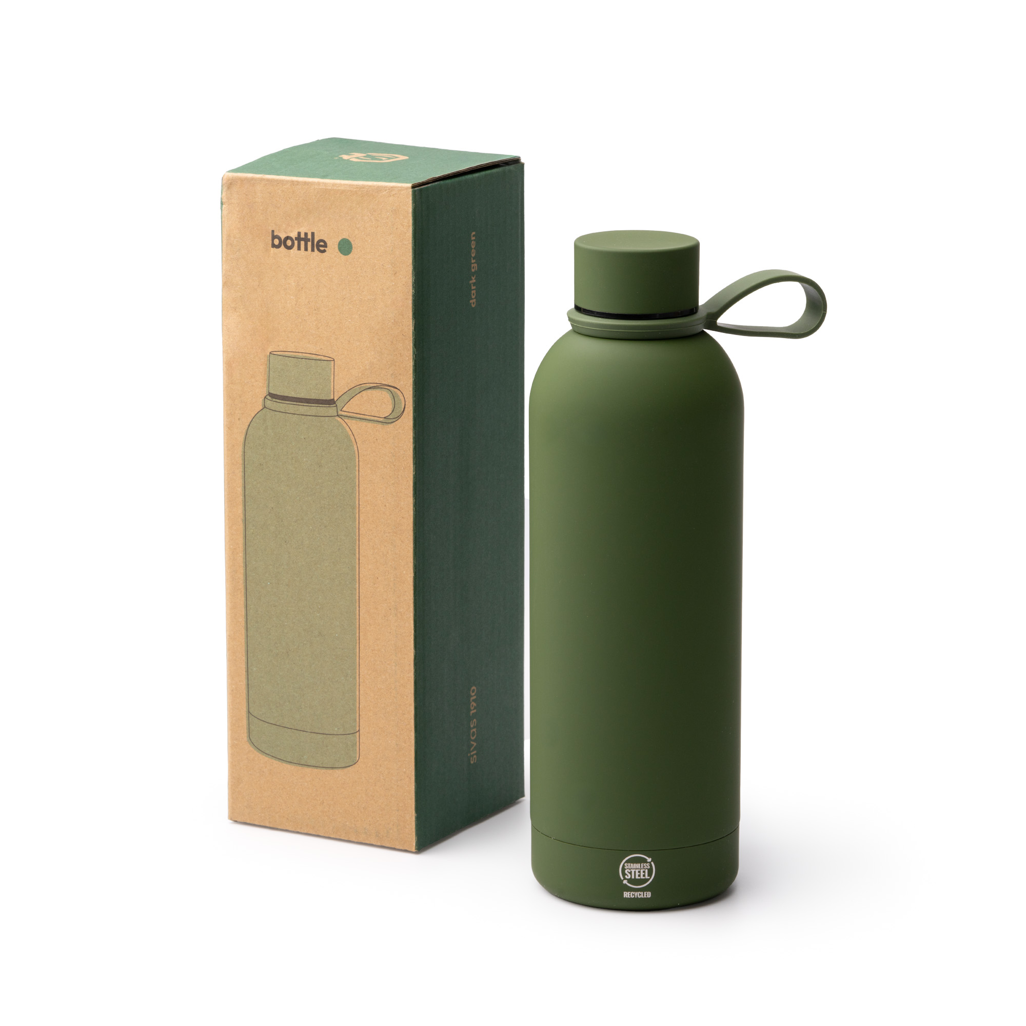 Bidón térmico de elaborado en acero inoxidable 304 reciclado. Tiene una capacidad de 500ml. Se caracteriza por contar con un cuerpo en acabado suave tacto goma. Además incorpora un asa de silicona, lo que la hace flexible y cómoda en su uso y transporte. Cuenta con un sistema antigoteo gracias al anillo de silicona incorporado en el interior de su tapa. La tapa y el asa van a conjunto del cuerpo.