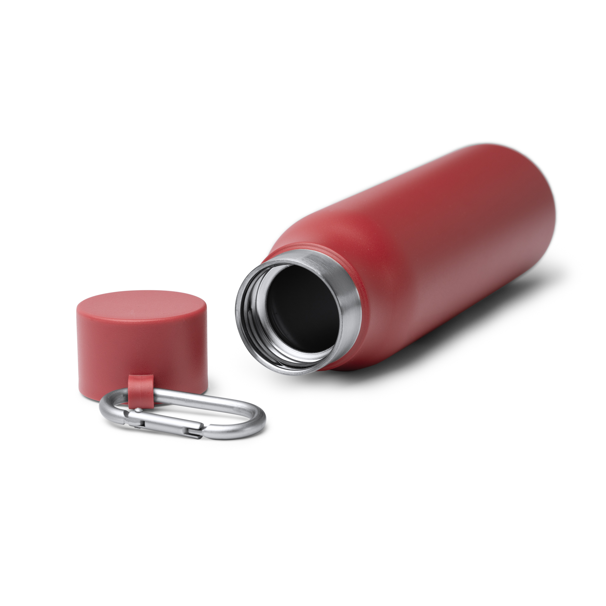 Bidón térmico de doble pared elaborado en acero inoxidable 304 reciclado en acabado mate. Capacidad de 550 ml. Tapón a juego. Incluye mosquetón para transporte.