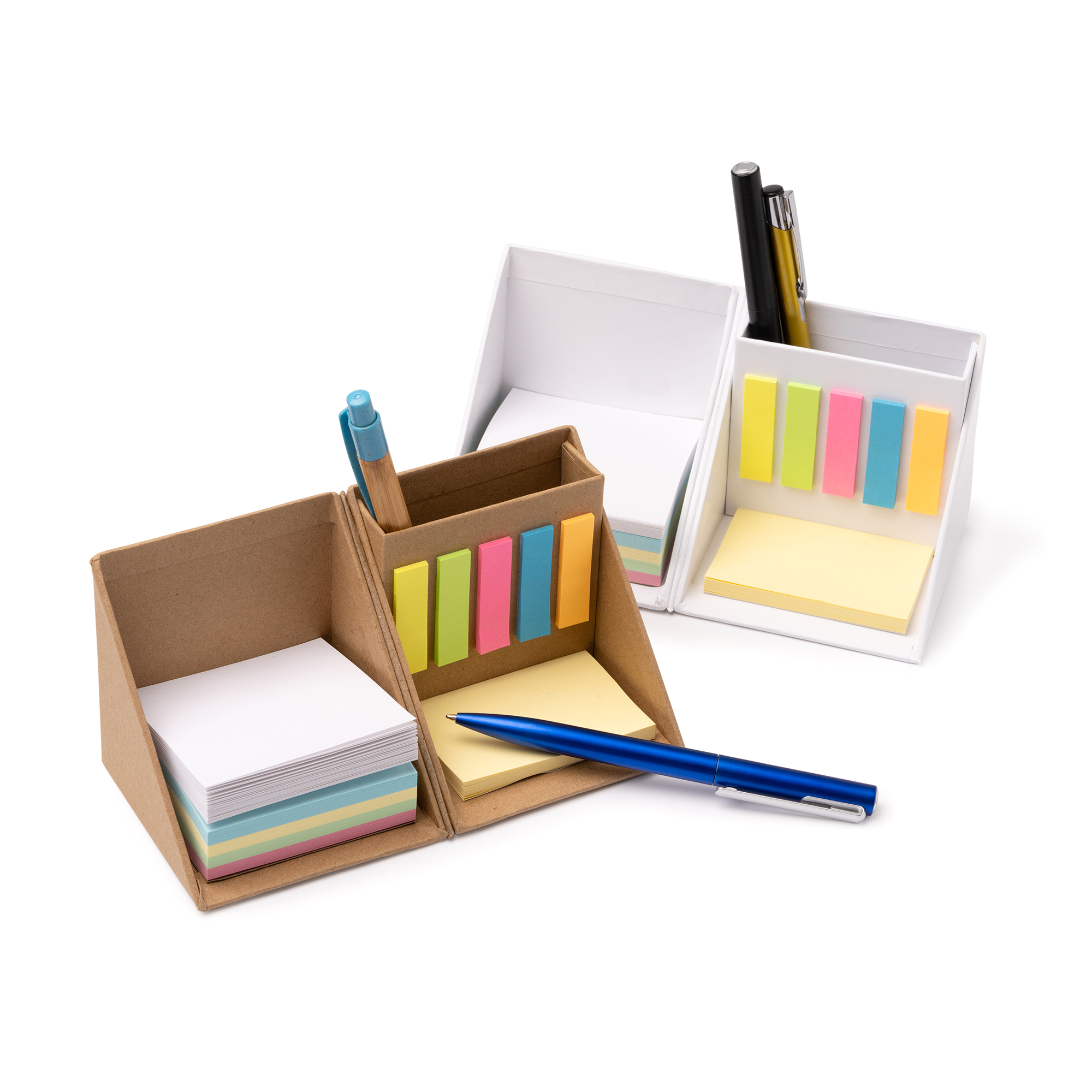 Set de escritorio de cartón en forma de cubo compuesto por lapicero, bloc de notas (250 hojas) y 180 notas adhesivas en varios colores.