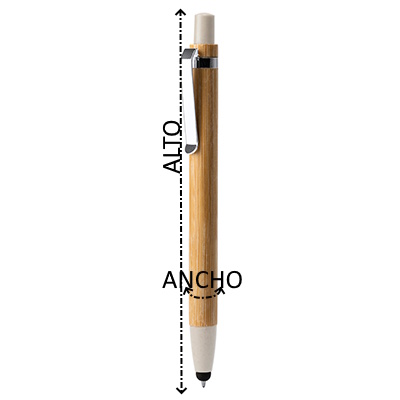 Bolígrafo pulsador con cuerpo de bambú, accesorios en fibra de bambú y clip metálico. Carga jumbo o carga doble. Incluye puntero táctil.