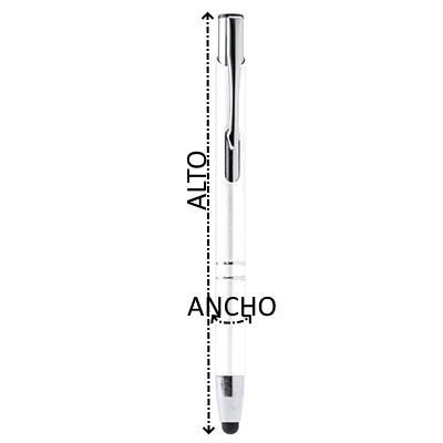 Bolígrafo con cuerpo de aluminio y pulsador en acabado cromado. Puntero táctil y carga jumbo de tinta azul. Disponible en varios colores.
