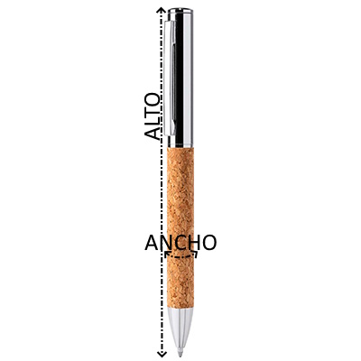 Elegante bolígrafo metálico con acabado cromado y empuñadura de corcho. Carga jumbo metálica de tinta azul. Presentación en caja elaborada en corcho.