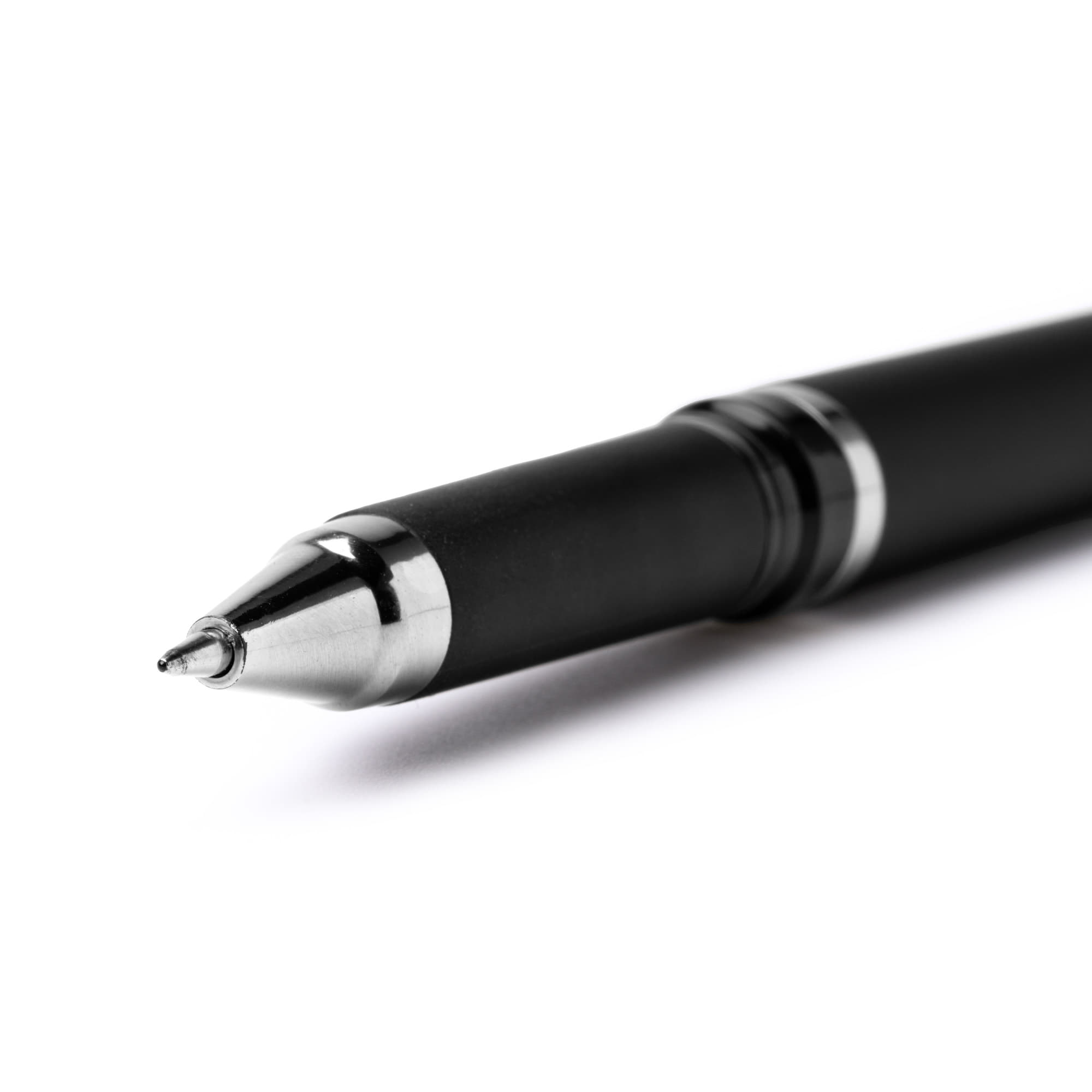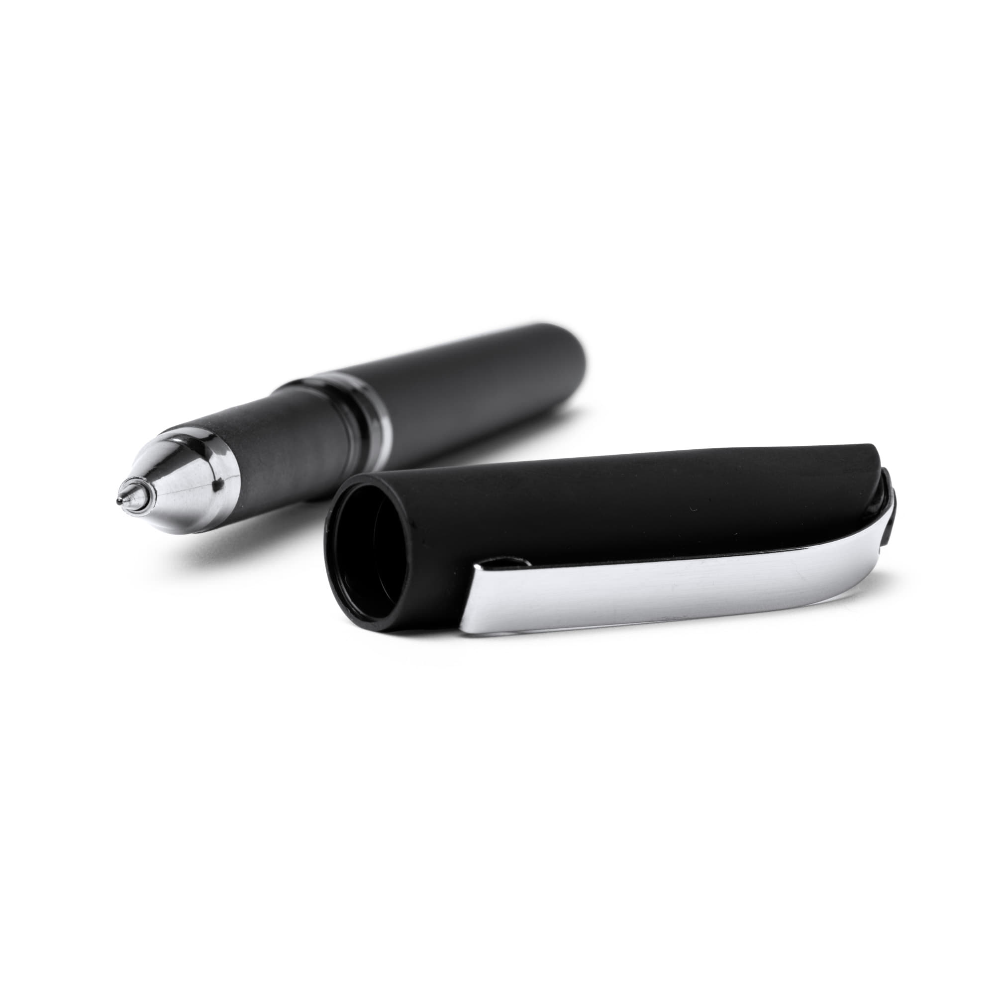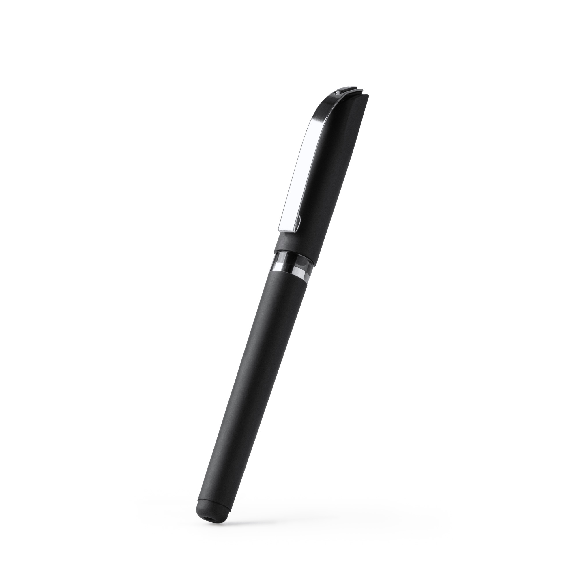 Bolígrafo roller elaborado en resistente ABS con tacto de goma en acabado mate. Cuenta con tapa con clip y detalles metalizado. Carga jumbo de tinta gel azul.