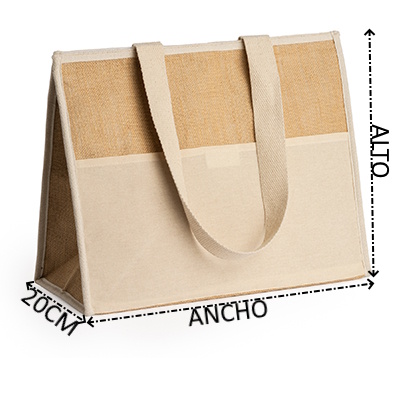 Bolsa nevera de yute laminado. Interior isotérmico de aluminio con cierre de velcro. Mantén tu comida y bebida en buena temperatura. Bolsillo frontal y asas en algodón natural.