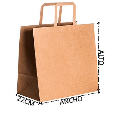 Bolsa de papel de 80 g/m² en acabado natural. Asas cortas reforzadas de diseño plano. Ideal para hostelería y restauración (take away).