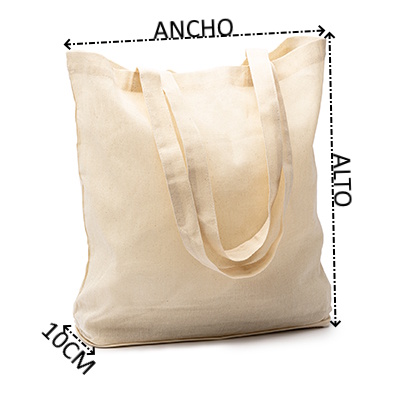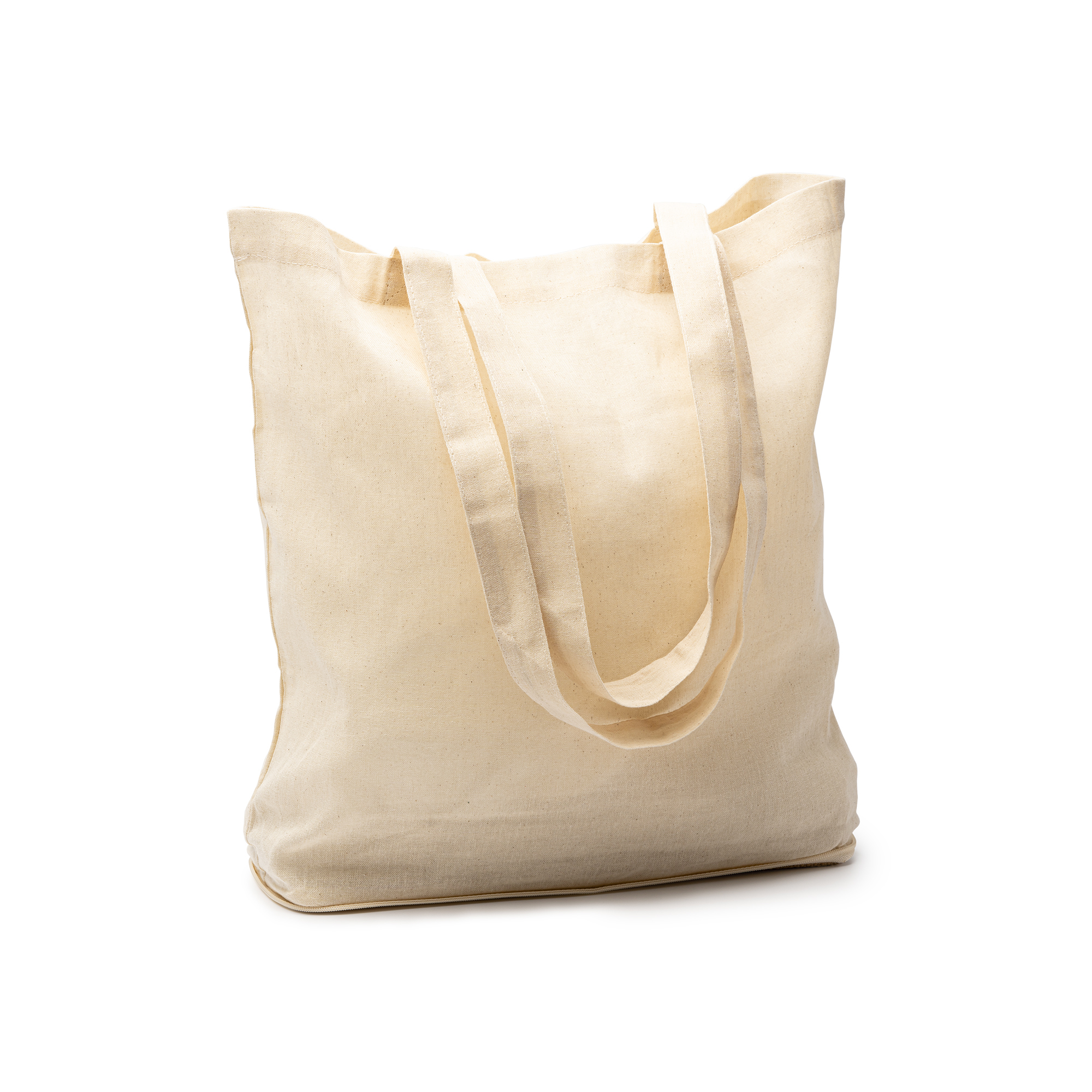 Bolsa plegable 100% algodón de 110 g/m² con base de yute. Incluye bolsillo exterior. Asas reforzadas de 60 cm. Fácil plegado y cierre de cremallera.