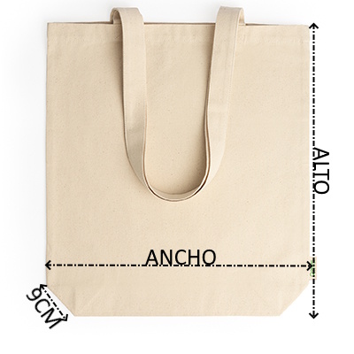Bolsa 100% algodón orgánico de 280 g/m² con fuelle para mayor adaptabilidad y versatilidad. Incorpora prácticas asas largas de 70cm para convertirla en una opción cómoda en sus transporte.