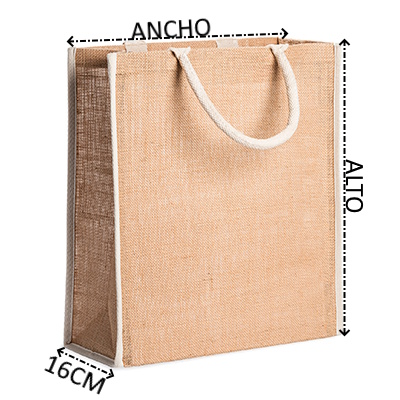Bolsa de yute natural laminado con ribetes y asas reforzadas de algodón. Acabado cosido.