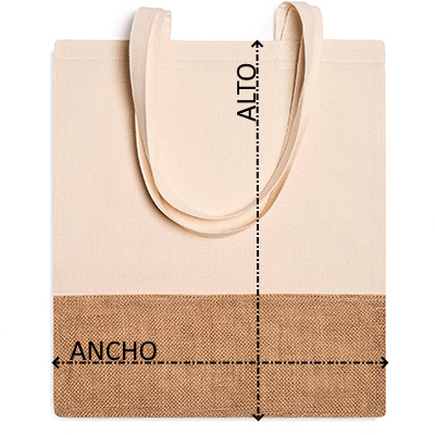 Bolsa de la compra de algodón de 120 g/m² y yute. Diseño en color natural, por un lado de la bolsa presenta una banda de yute en la parte inferior. Cuenta con asas largas de 70 cm.