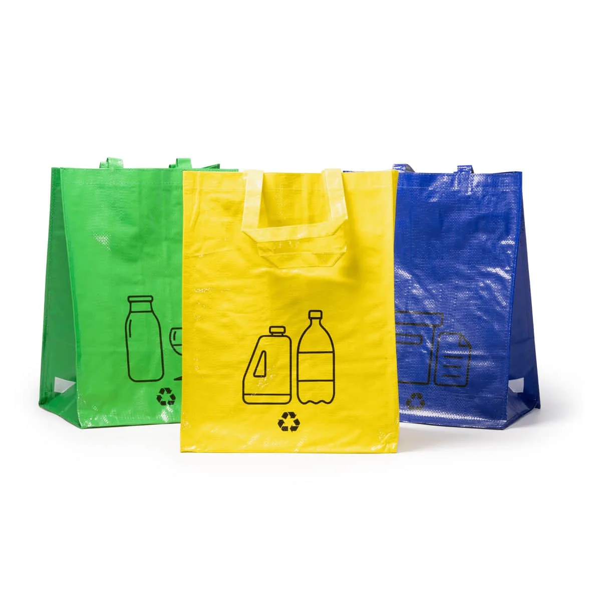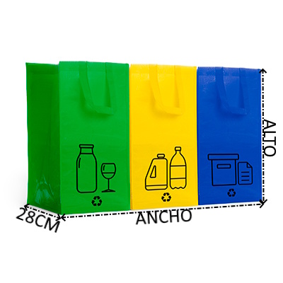 Set de 3 bolsas de reciclaje realizadas en resistente pp-woven laminado con velcros laterales y asas reforzadas.