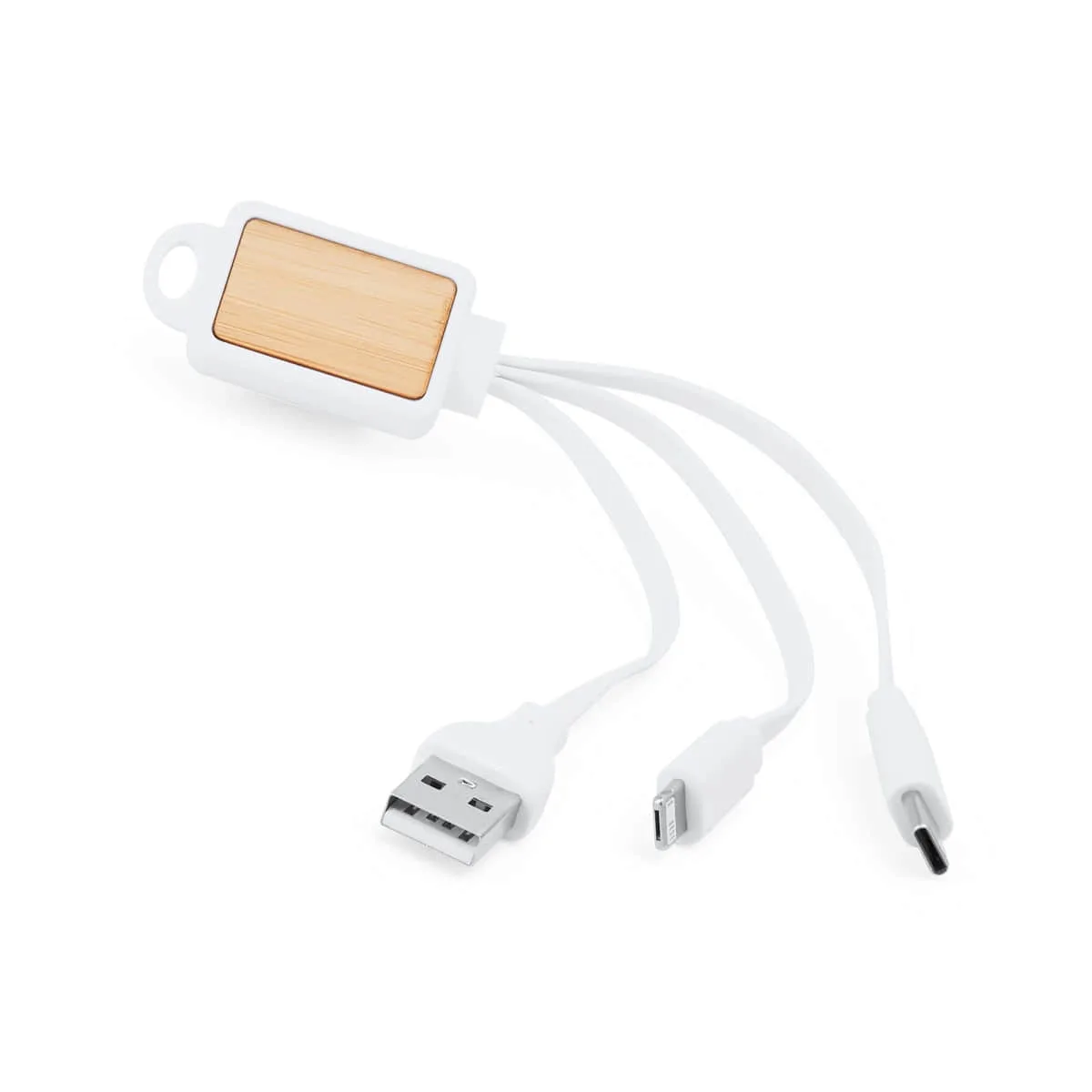 Cable cargador 3 en 1 diseñado con cuerpo rectangular en bambú. Conexión Tipo C, USB y Lightning.