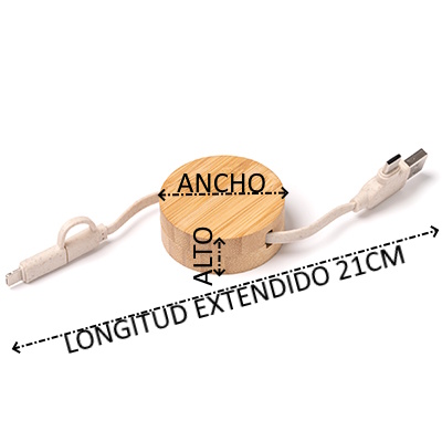 Cable cargador extensible con cuerpo elaborado en bambú y cable en fibra de trigo. Entrada USB y Tipo C en una sola clavija. Salida Lightning y Tipo C con adaptador insertado.