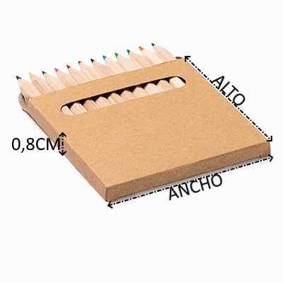 Set de 12 lápices de colores de madera en caja de cartón reciclado.