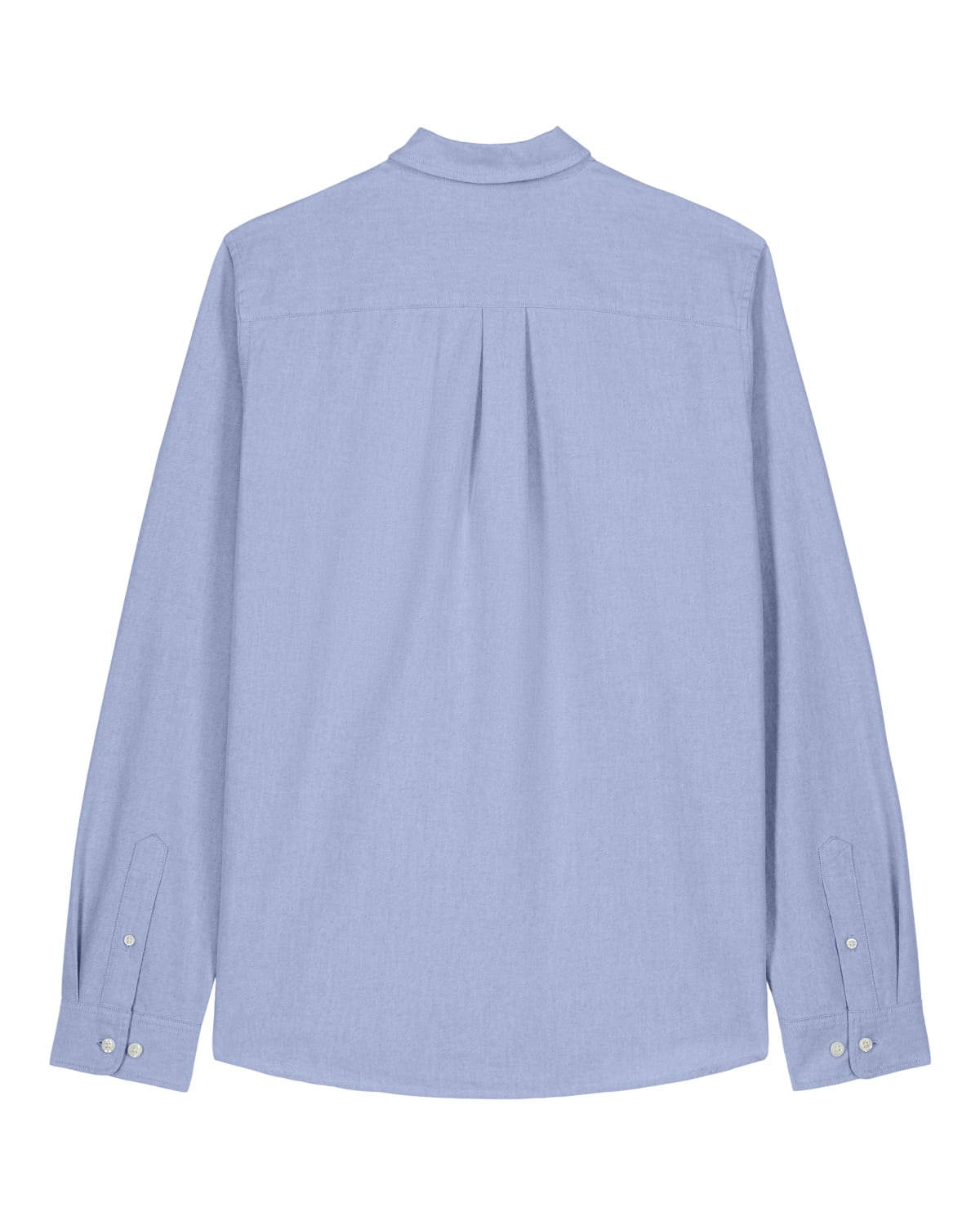 Cuello abotonado con pespuntes de aguja simple Pie de cuello Tapeta delantera con pespuntes de aguja simple en cada lado Hombro adelantado Canesú trasero con pliegue de caja Canesú interior en el mismo tejido Mangas montadas Tapeta de la manga con un botón Puño con dos botones Esquinas de los puños redondeadas Pliegues dobles en la costura del puño