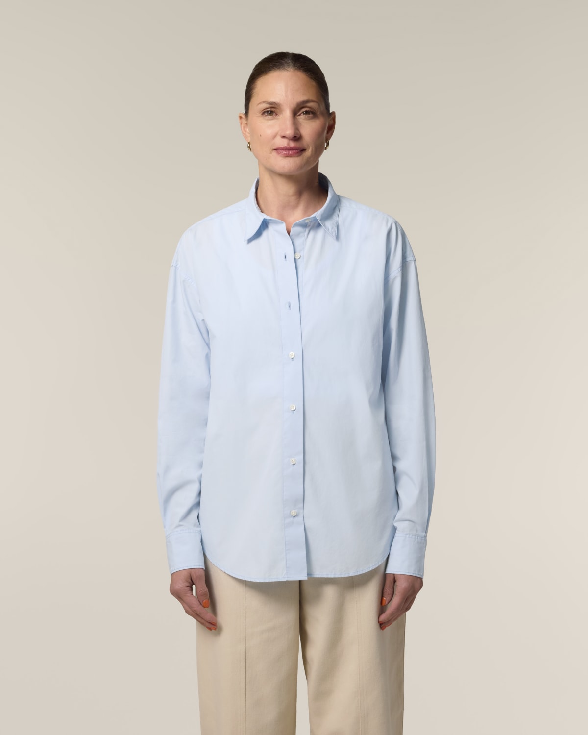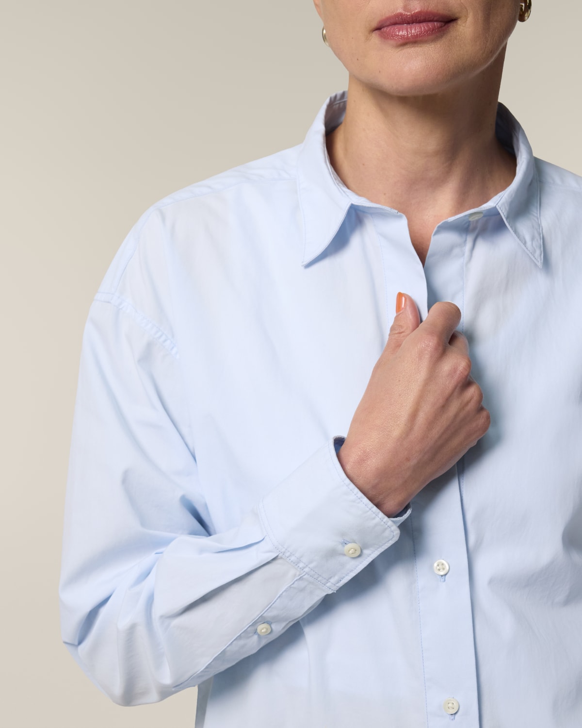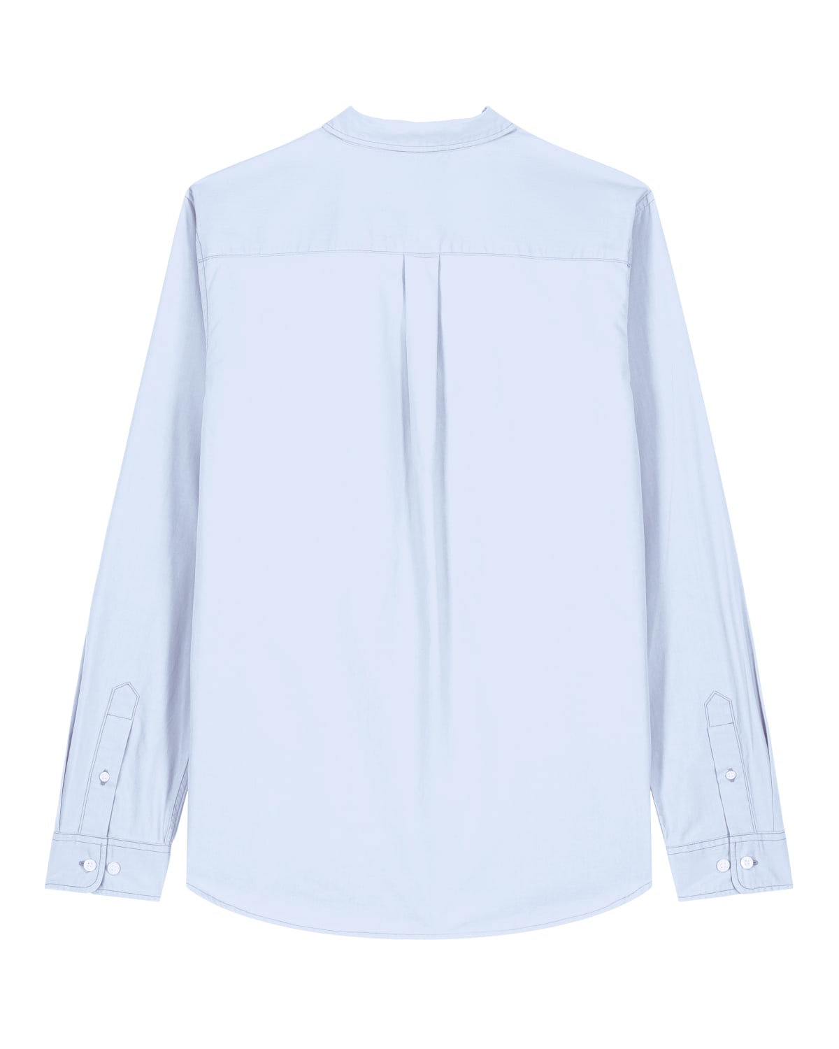 Cuello de punta con pespuntes de aguja simple Pie de cuello Tapeta integrada con pespuntes de aguja simple en cada lado Hombro adelantado Canesú trasero con pliegue de caja Canesú interior en el mismo tejido Hombros caídos Tapeta de la manga con un botón Puño de la manga con dos botones Esquinas de los puños redondeadas Pliegues dobles en la costura del puño