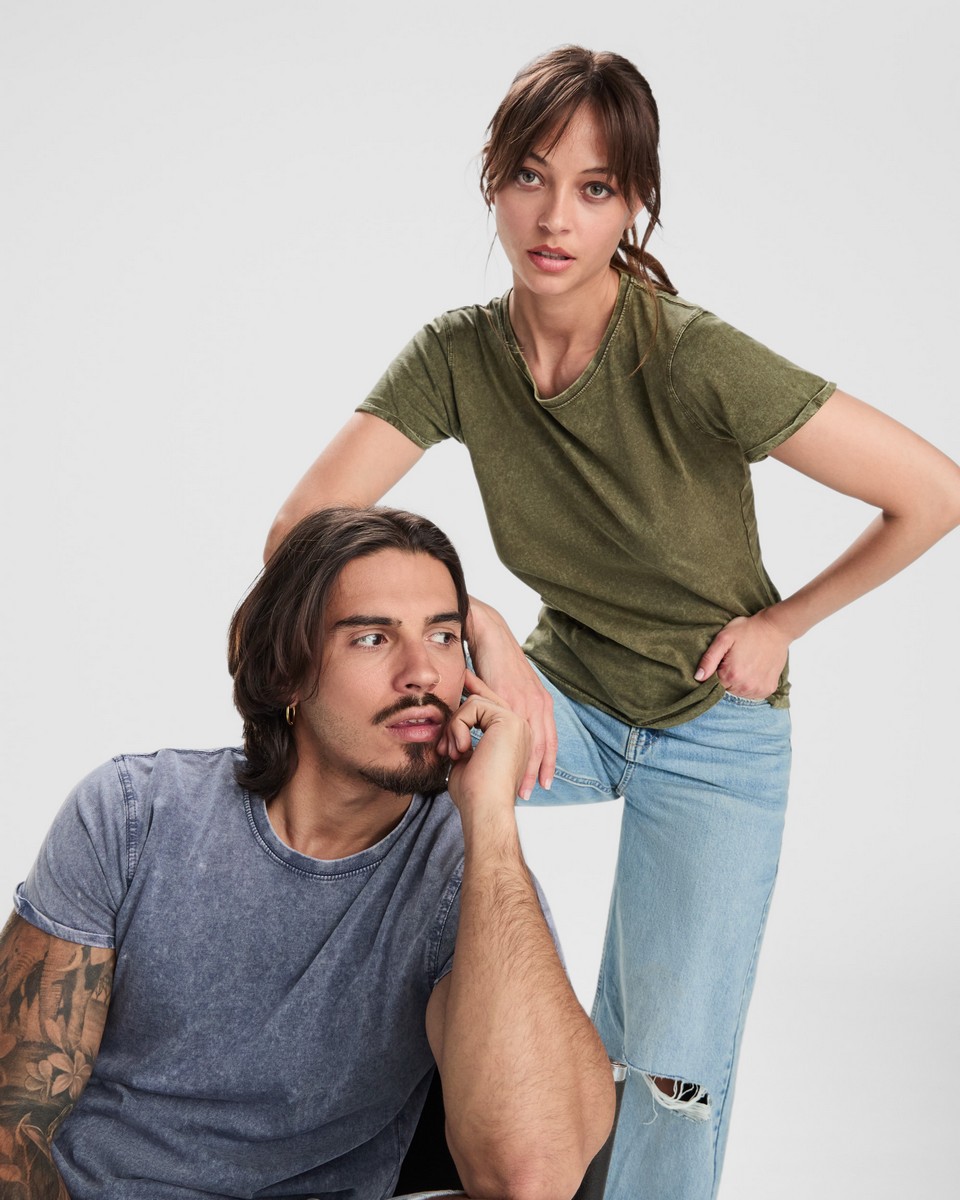 Camiseta de manga corta efecto jeans para mujer. Cuello fino redondo en canalé 1×1 con cubrecosturas de refuerzo de hombro a hombro. Doble costura en sisas. Apertura de manga con dobladillo.