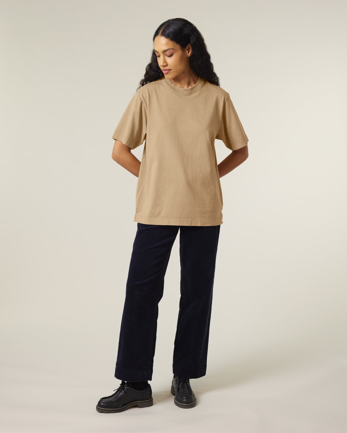 Manga montada Costilla 1×1 en el cuello Doble costura en los puños de las mangas y dobladillo inferior Cinta interna en el cuello de la misma tela Tejido ligeramente más áspero Sombreado leve en las costuras para dar aspecto lavado Producto teñido en prenda, cada prenda puede variar en apariencia, el color puede sangrar, seguir nuestra etiqueta de cuidado Leer cuidadosamente las recomendaciones de impresión