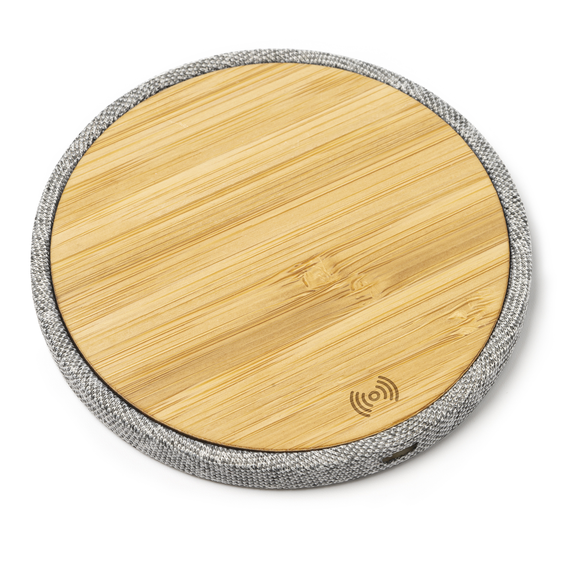Cargador inalámbrico con cuerpo elaborado en tejido RPET y superficie de carga en bambú. Compatible con dispositivos provistos de tecnología de carga inalámbrica. Potencia de carga 10W. Cable de conexión tipo C incluido.