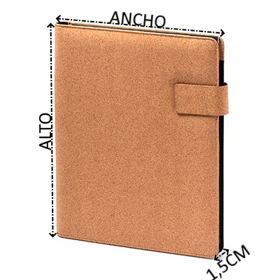 Carpeta A4 multiusos de corcho con cierre magnético. Incluye bloc extraíble de 30 hojas a una raya, 4 compartimentos interiores y soporte para bolígrafo.