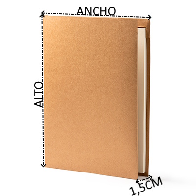 Carpeta de cartón reciclado. Incluye bloc extraíble de 20 hojas lisas, bolígrafo a juego con fibra de trigo, solapa y tarjetero. Una carpeta concienciada con el medio ambiente.