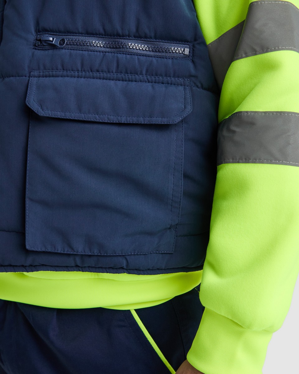 El chaleco reversible multibolsillos y alta visibilidad Persei tiene dos partes reversibles, una más discreta de color azul marino y la otra en color amarillo flúor con dos cintas reflectantes horizontales, vamos que te verán a lo lejos con el puesto.