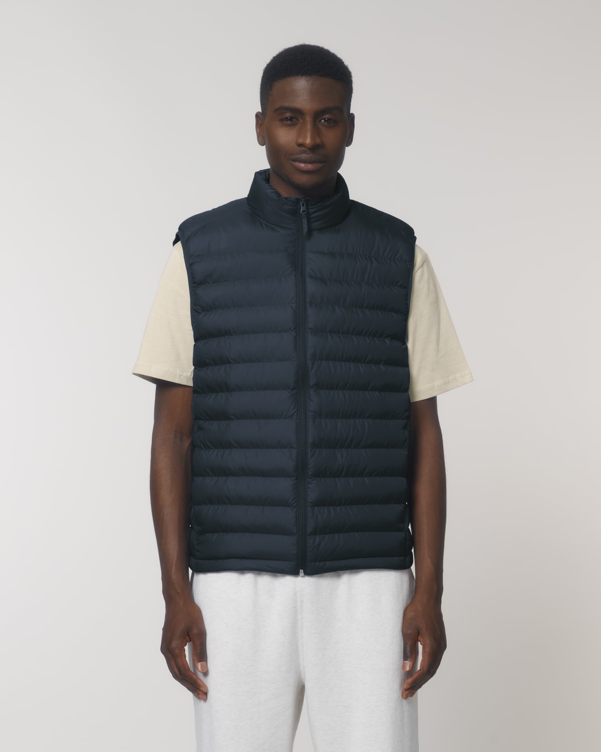 Sin mangas Cuello alto Cremallera delantera de nylon invertida Bolsillos de ojal con cremallera y tirador de grogrén Bies elástico en sisas Enteramente acolchado Piezas laterales para mejorar el corte Costuras interiores ribeteadas Bajo con tope de plástico ajustable y cordón elástico