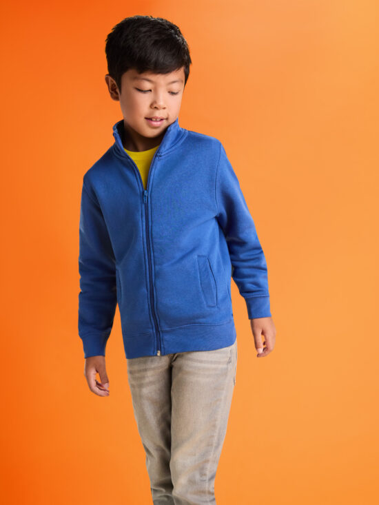 La chaqueta unisex infantil Ulan es una sudadera de cuello alto con cremallera central a tono, está compuesta con 50% algodón, 50% poliéster y felpa perchada en el interior. Para el color gris vigoré la composición es 55% algodón, 40% poliéster y 5 % viscosa.