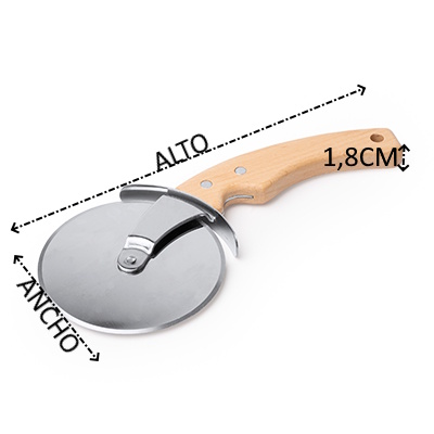 Cortador de pizzas elaborado en acero inoxidable con mango elaborado en madera con forma ergonómica de agarre para su cómodo uso.