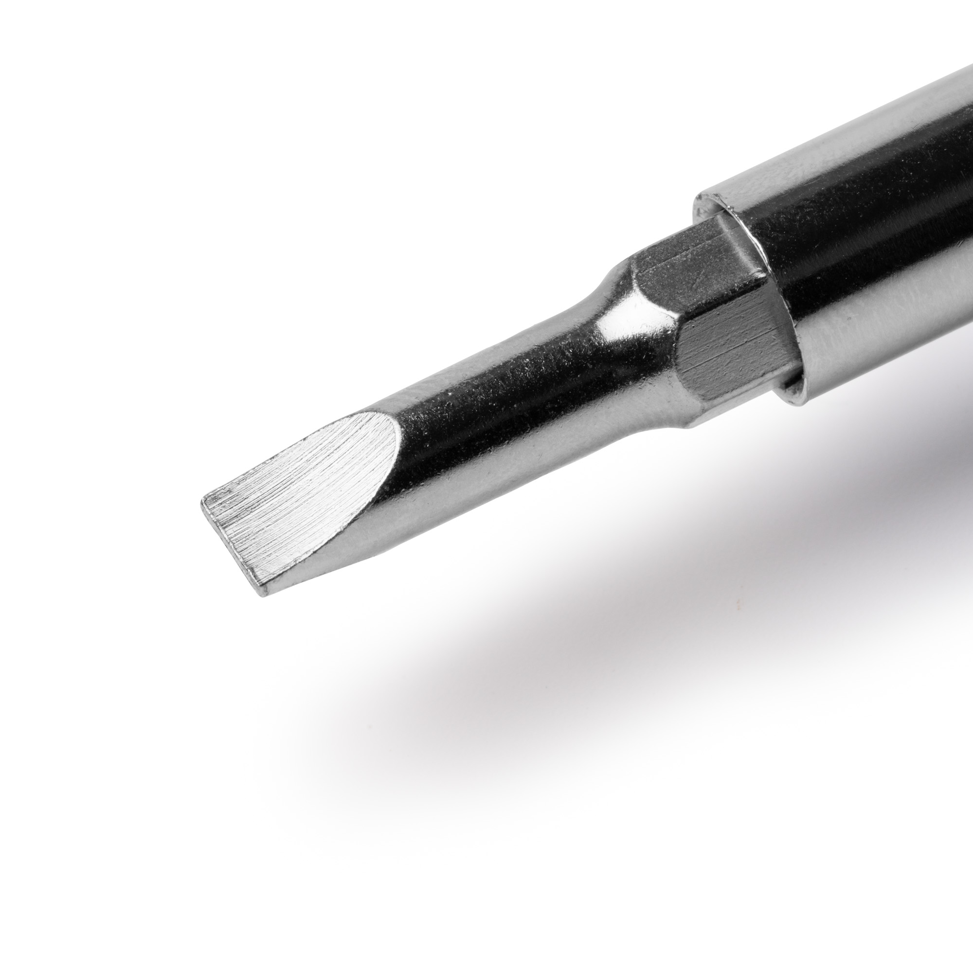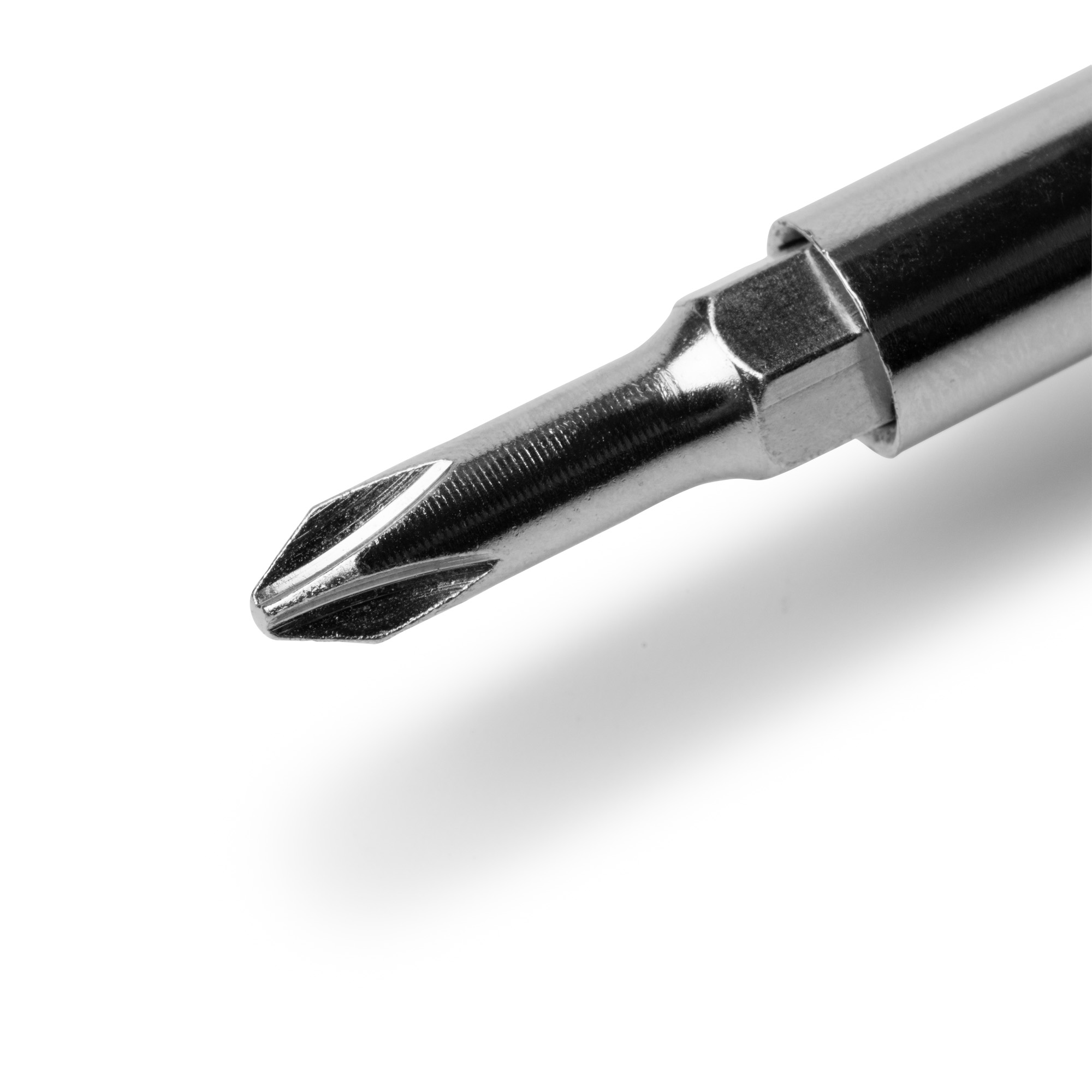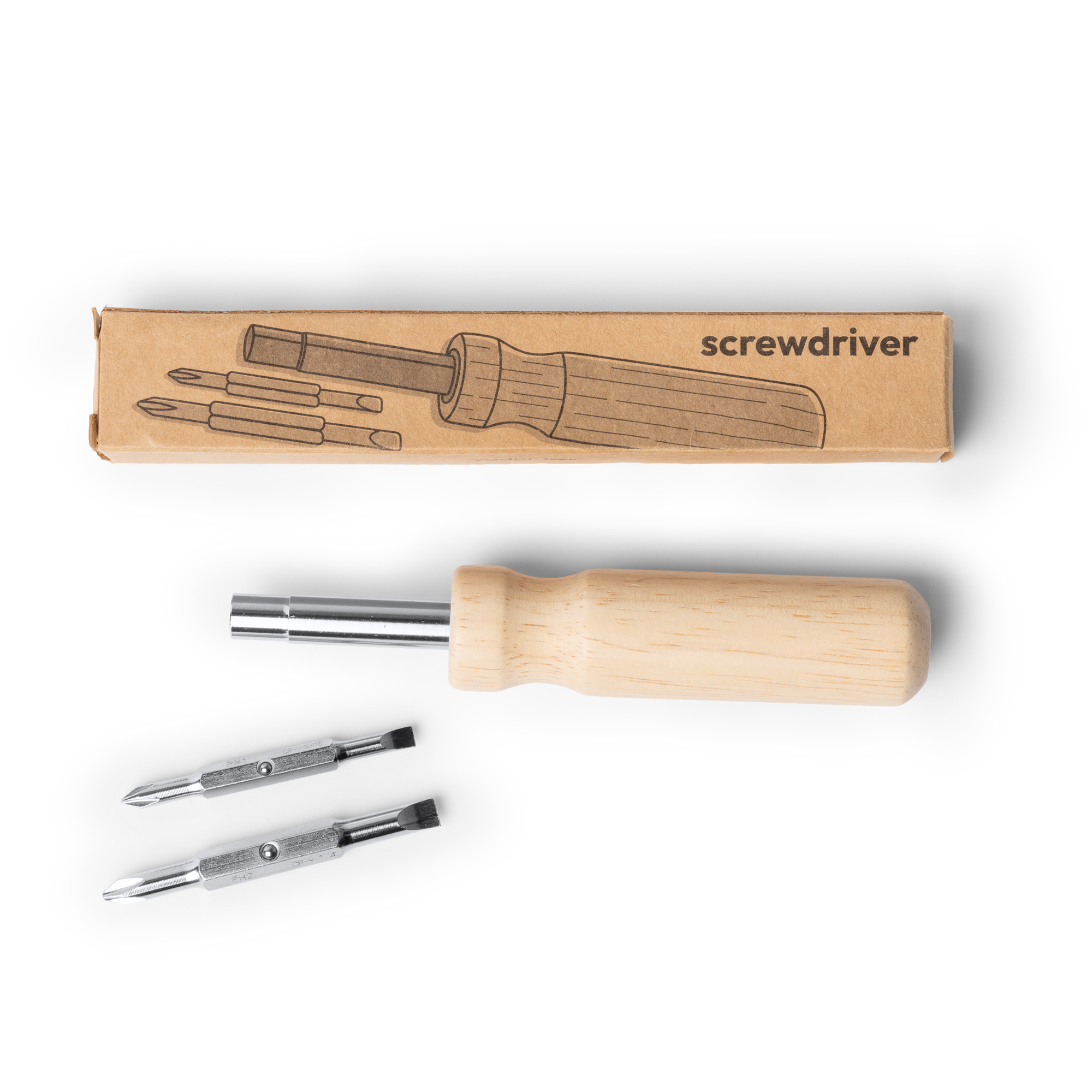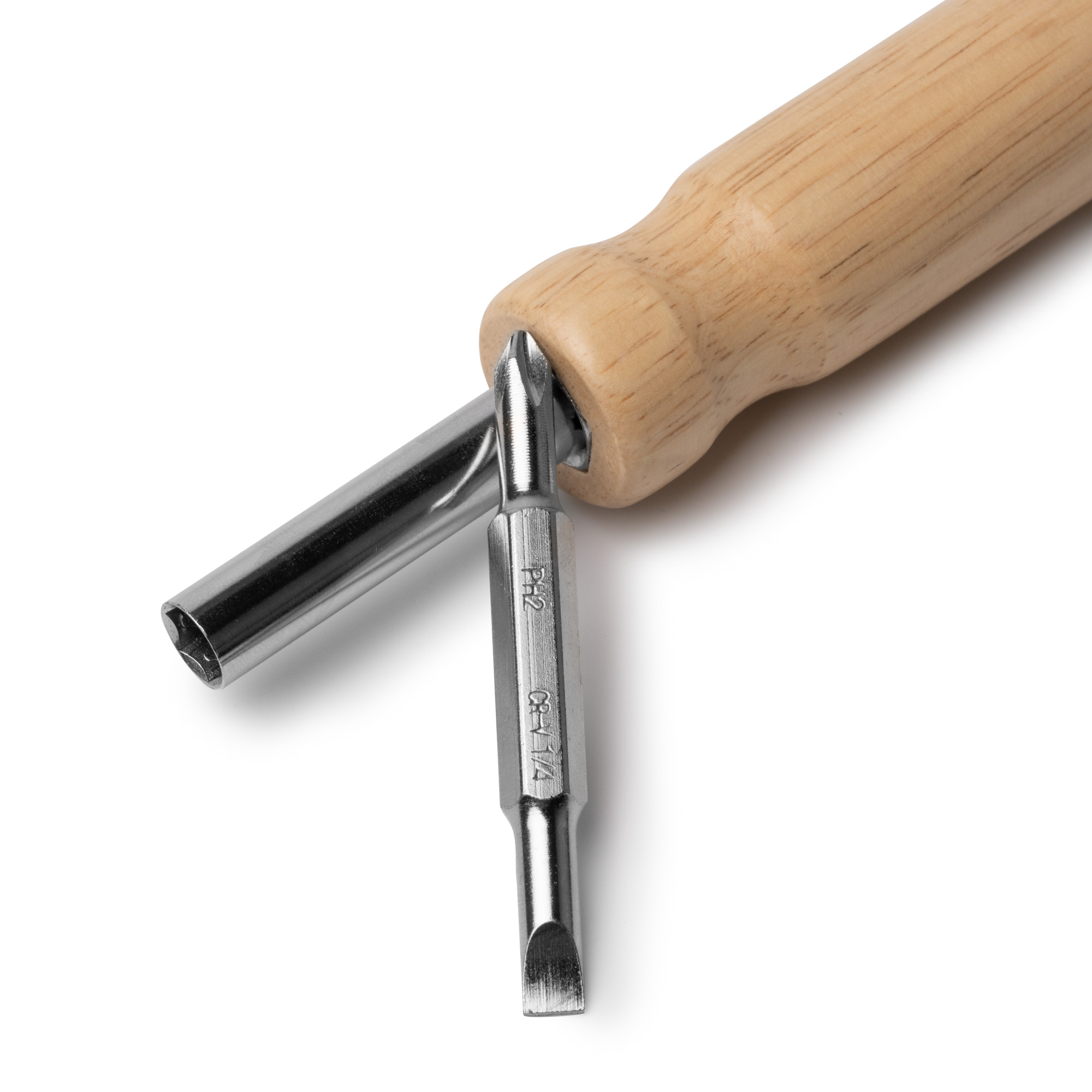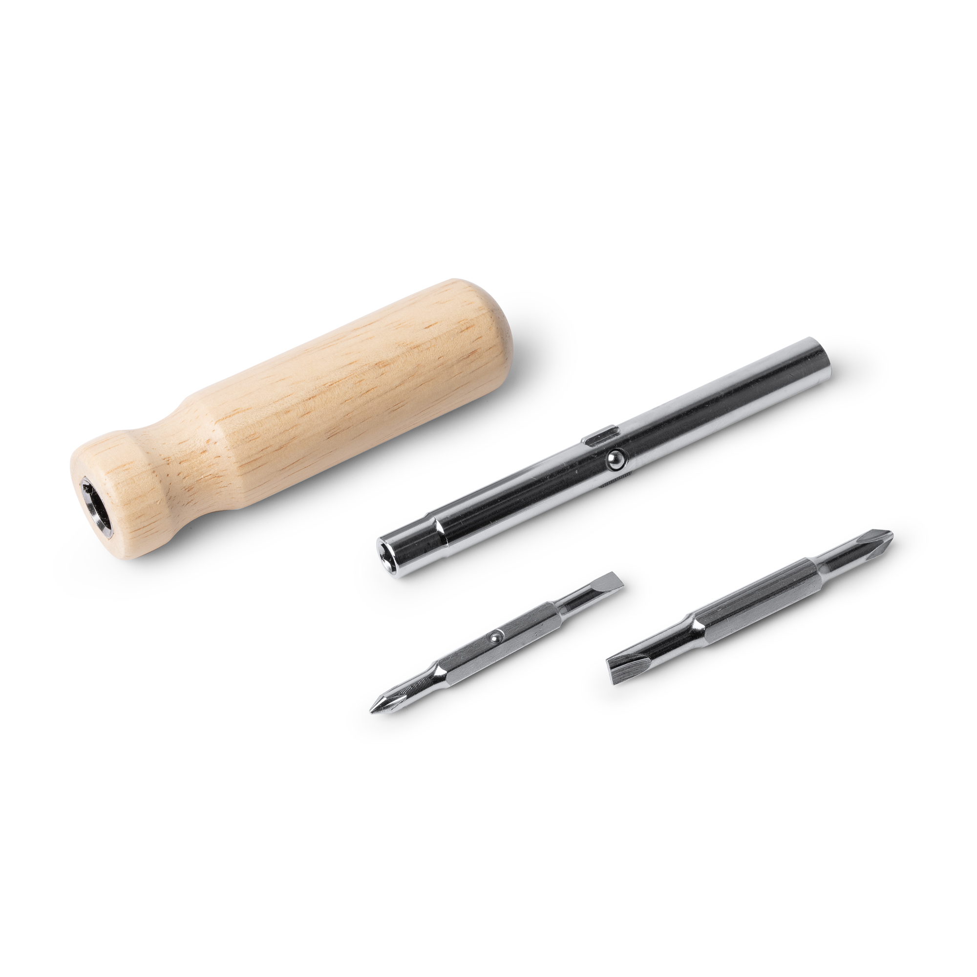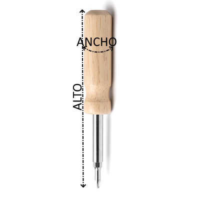Destornillador elaborado en acero inoxidable con mango redondo en madera. Cuenta con un sistema de puntas diferentes intercambiables de fácil montaje. Estas puntas incluyen destornillador de estrella y destornillador plano, ambos en dos tamaños diferentes.