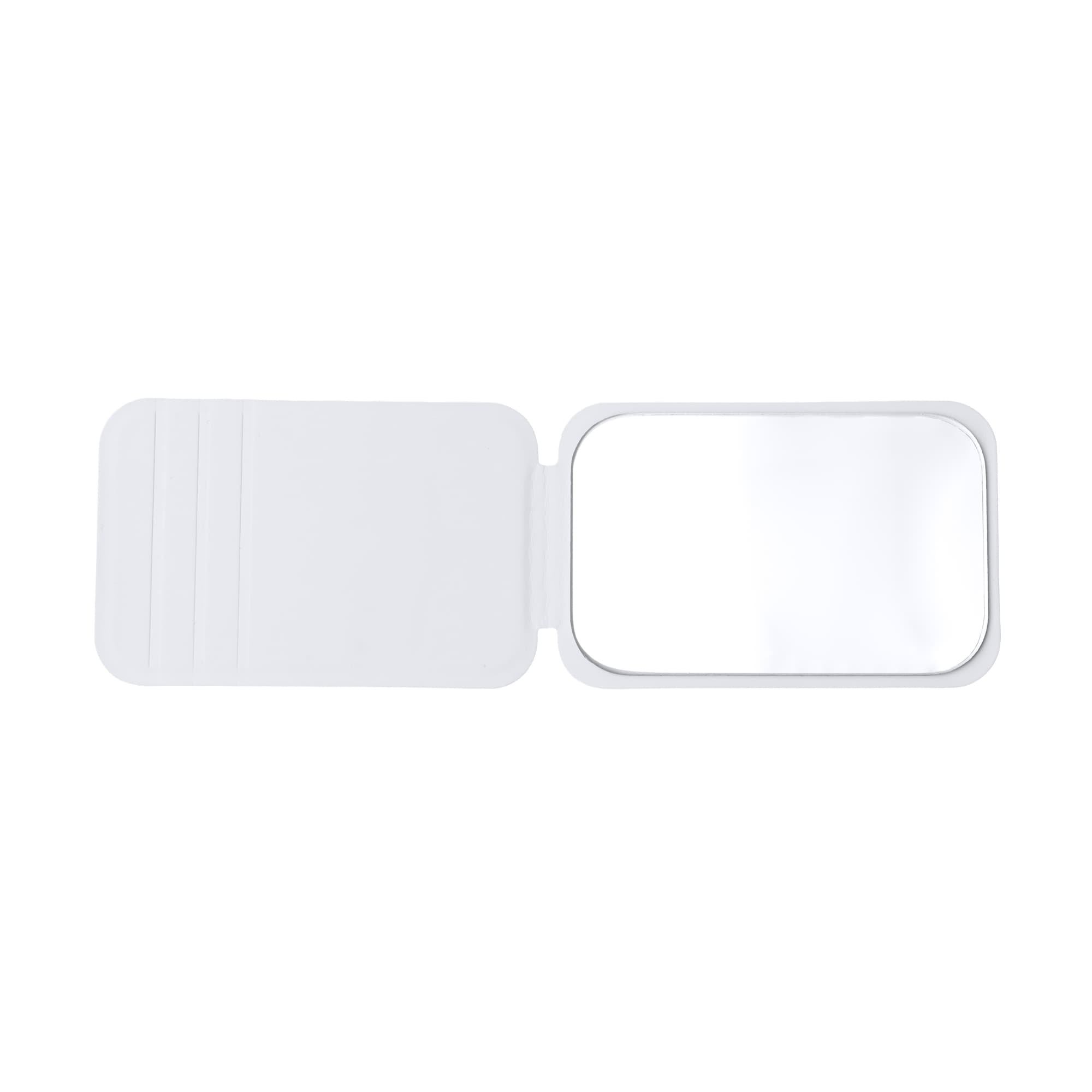 Espejo plegable elaborado en suave PU con soporte. Su tapa cuenta con diferentes ajustes para posicionar el espejo a diferentes alturas al plegarlo.
