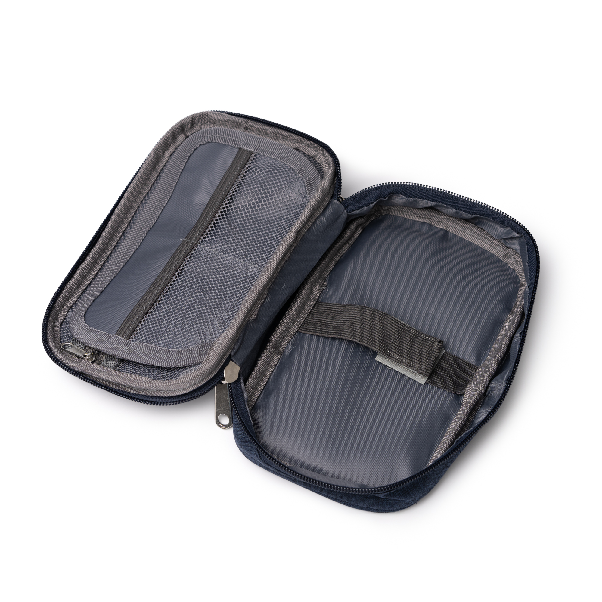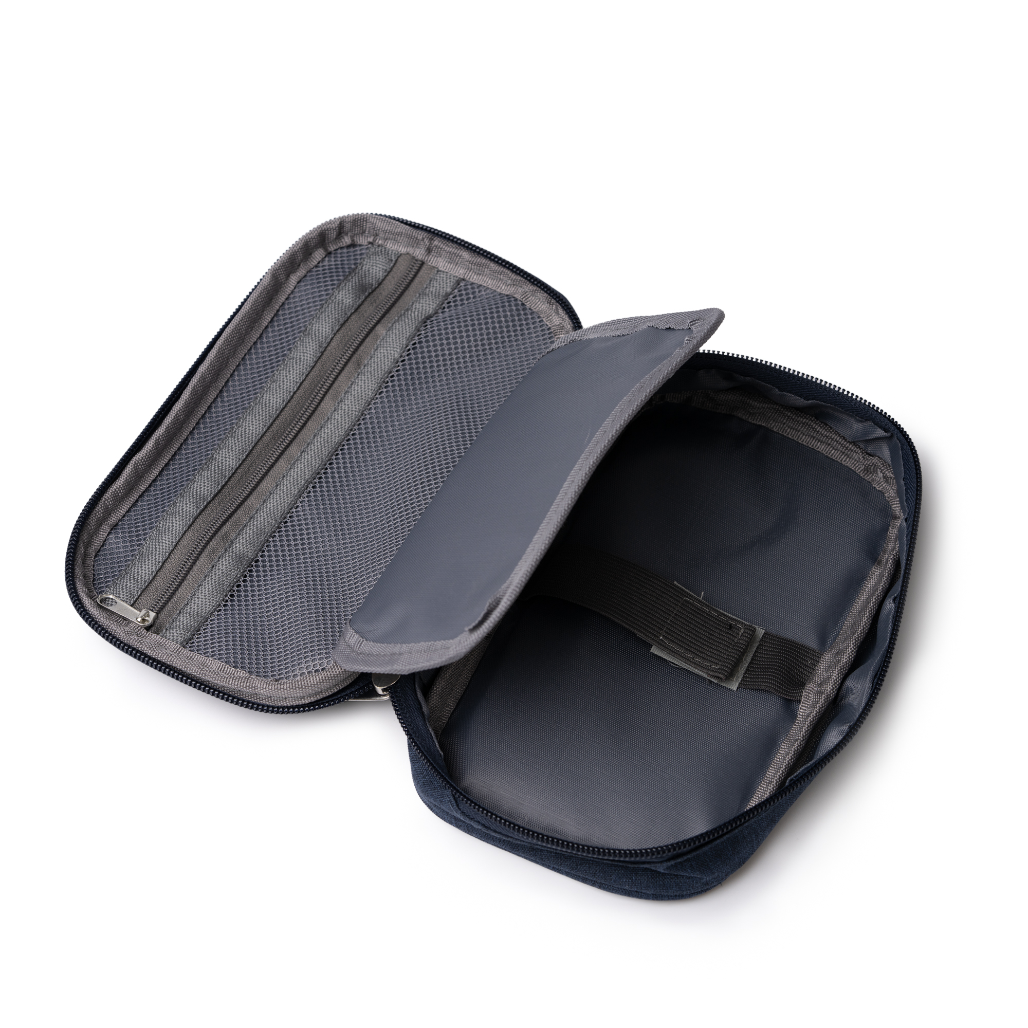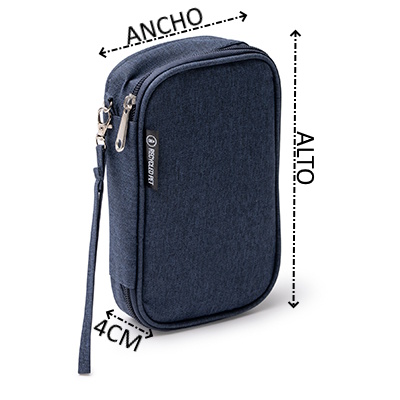 Estuche organizador elaborado en RPET, especialmente ideado para guardar y organizar cables. Cuenta con un compartimento de malla con cierre de cremallera, un compartimento principal con cierre de velcro y un compartimento intermedio para almacenamiento de pequeños objetos. Incluye correa de transporte a conjunto.