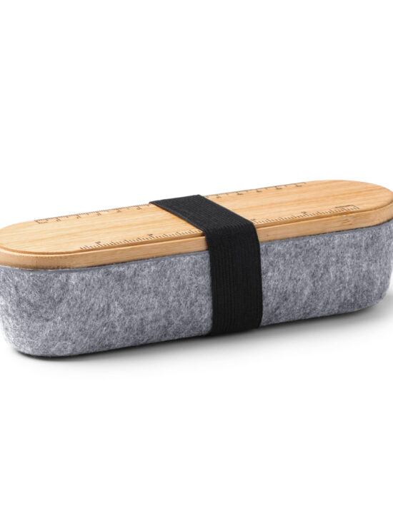 Estuche con tapa de bambú y cuerpo realizado en fieltro RPET. Tapa con función de regla y soporte para smartphone.