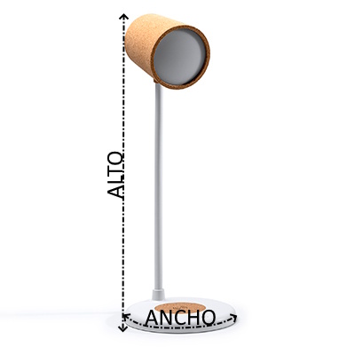Lámpara elaborada en ABS y corcho. Luz led con tres tipo de iluminación con ajuste de intensidad mediante botón multifunción integrado en la base. Incluye altavoz inalámbrico de 3W de potencia para reproducción de audio mediante conexión Bluetooth. Con indicador luminoso de conexión. Con base de carga inalámbrica con potencia de 10W para recarga de dispositivos provistos de esta tecnología.